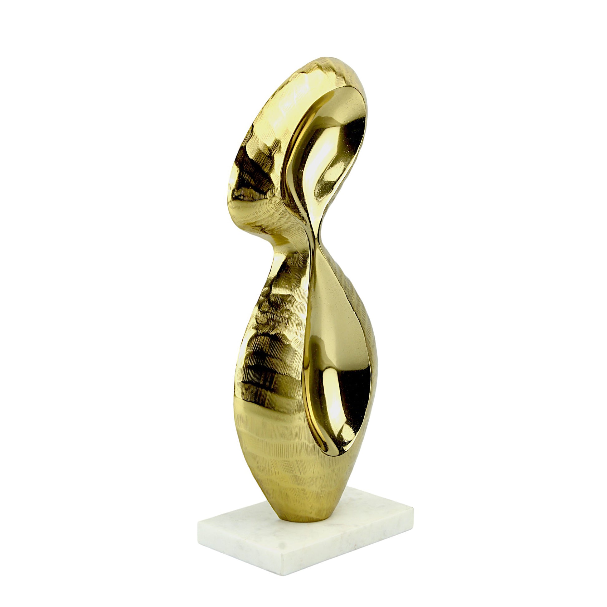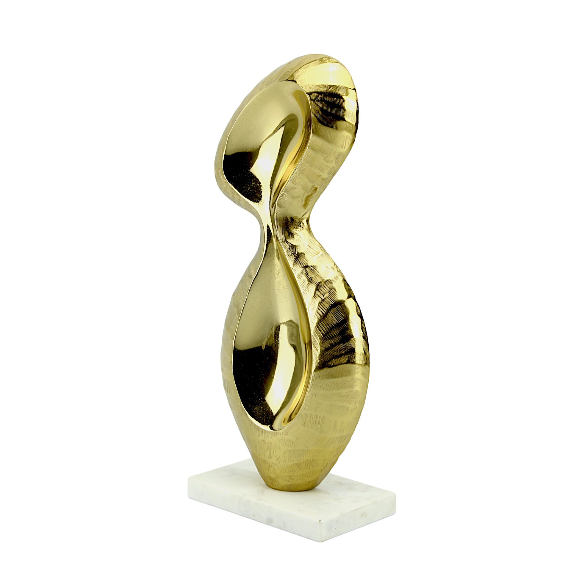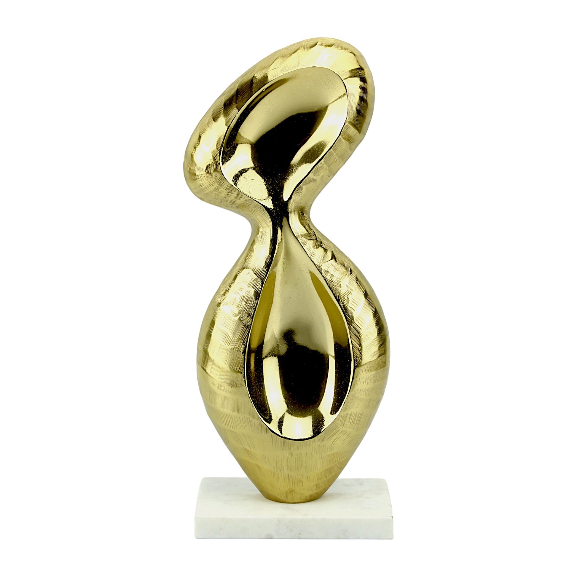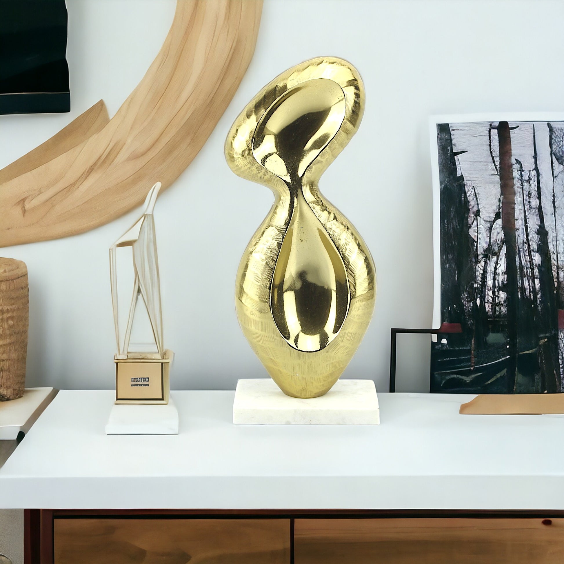 Golden Aluminum Abstract Sculpture: Handcrafted Art on White Marble Base