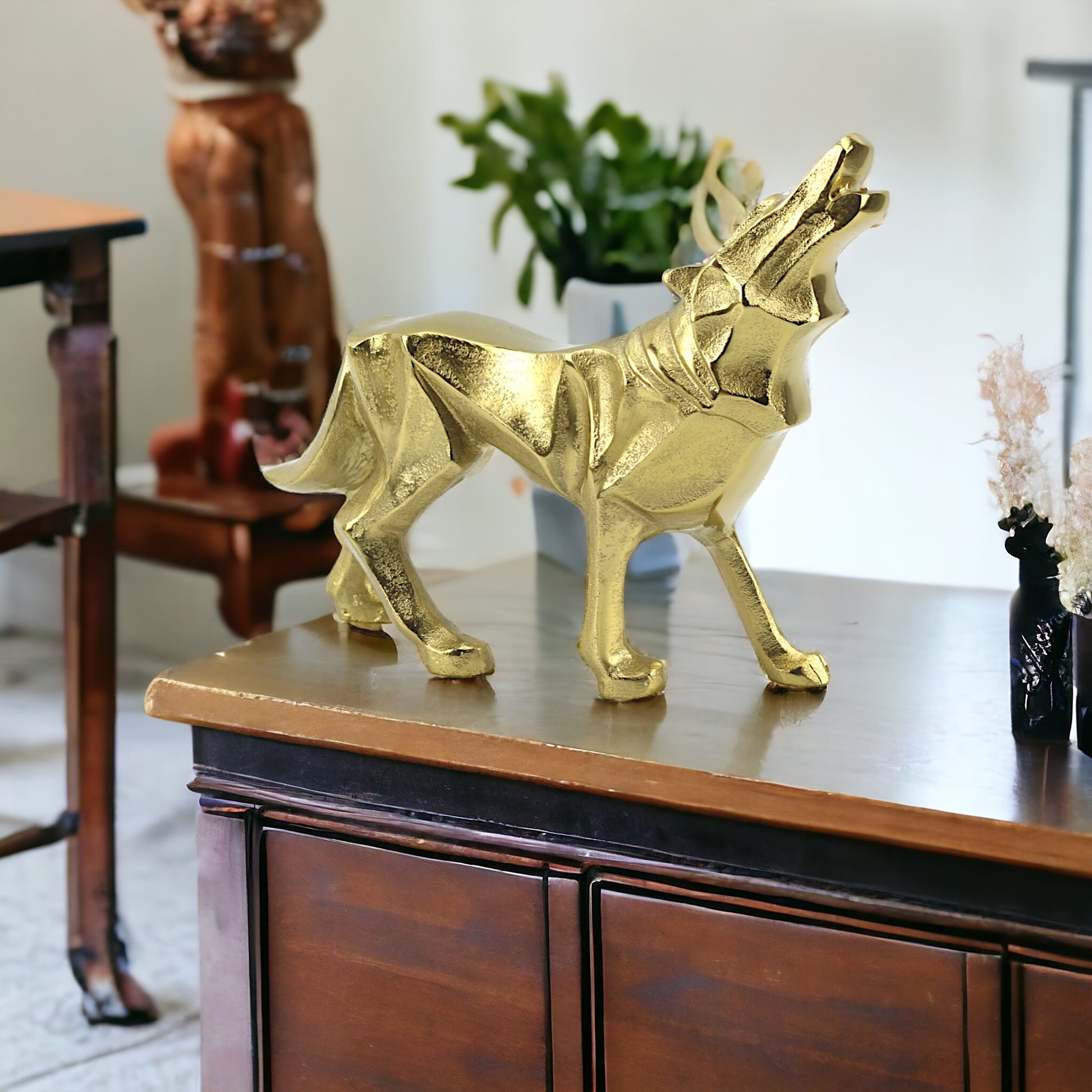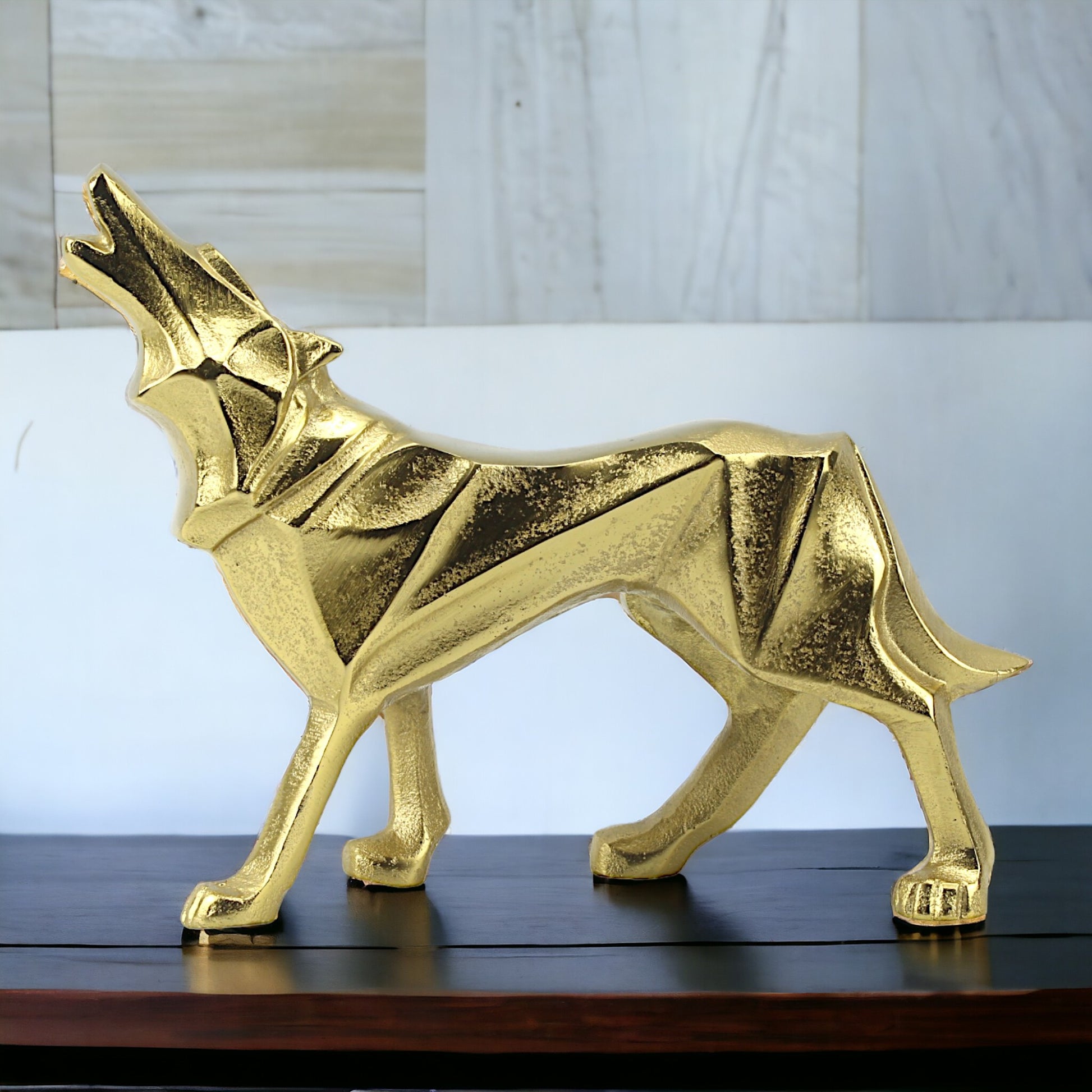 Introducing our captivating Golden Aluminum Howling Wolf Sculpture, a stunning piece of handcrafted art meticulously designed to capture the wild beauty and mystique of the majestic wolf. Crafted with intricate detail and finished in radiant gold, this sculpture serves as a striking ornament for wilderness enthusiasts and nature lovers alike.