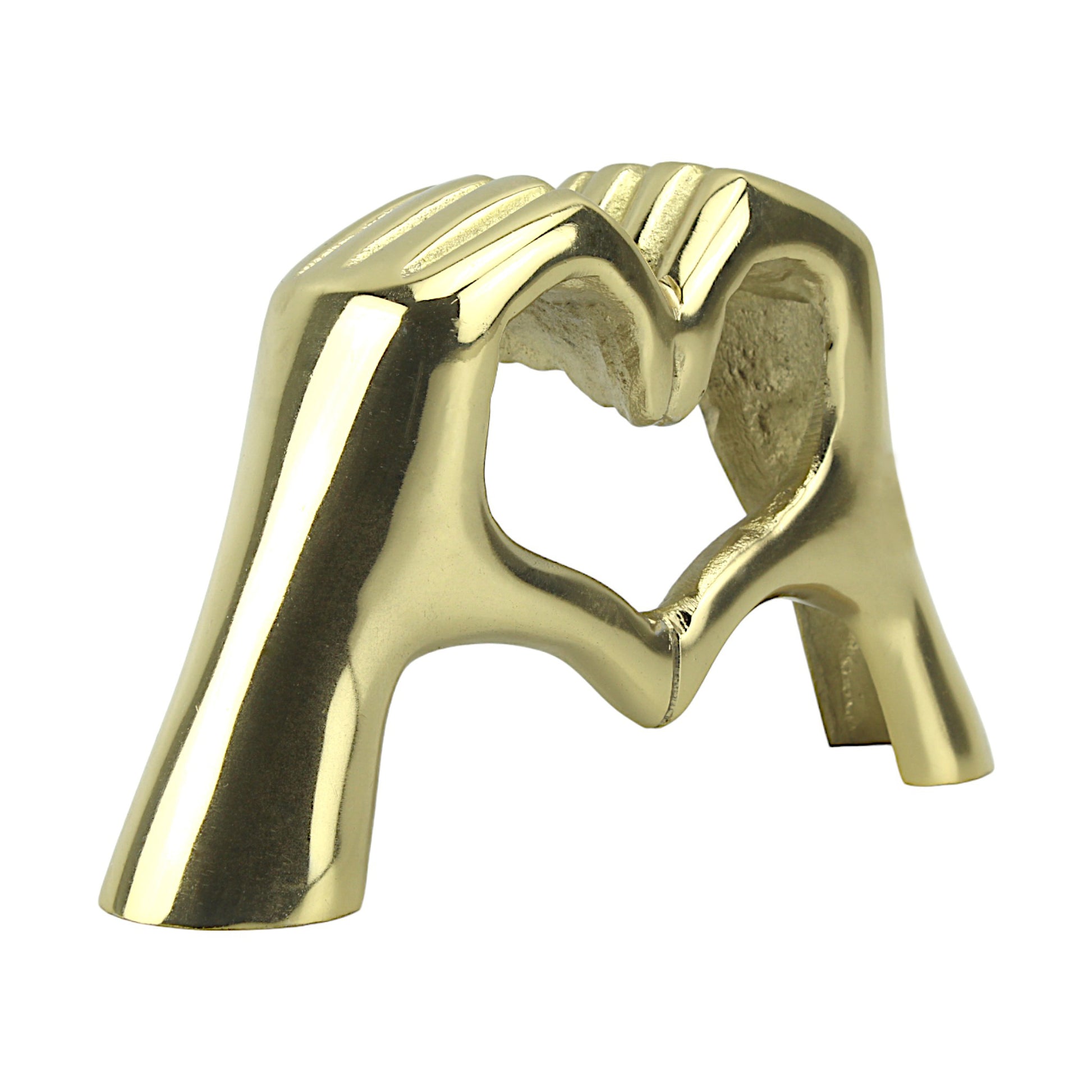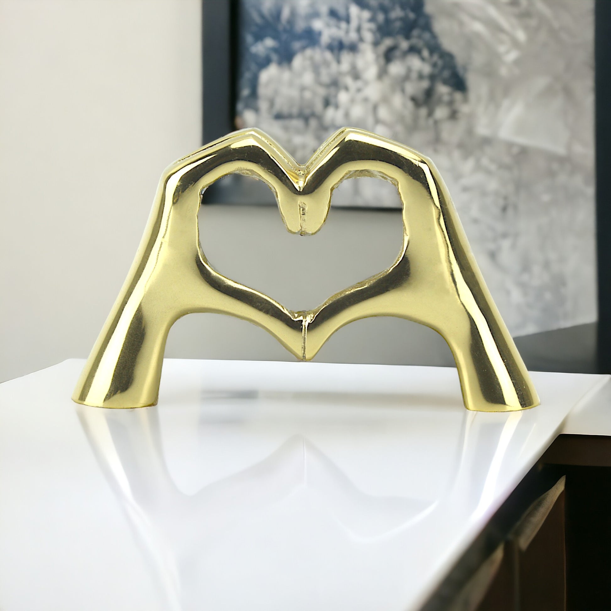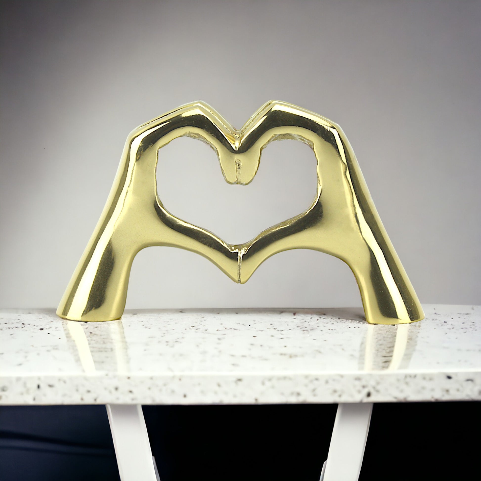 Introducing "Golden Embrace," a stunning handcrafted aluminum sculpture capturing the timeless essence of love and togetherness. Crafted with exquisite detail, this sculpture depicts two hands forming a heart, symbolizing the enduring bond between two souls. With its radiant golden finish and captivating design, "Golden Embrace" serves as a heartfelt accent piece for any home.