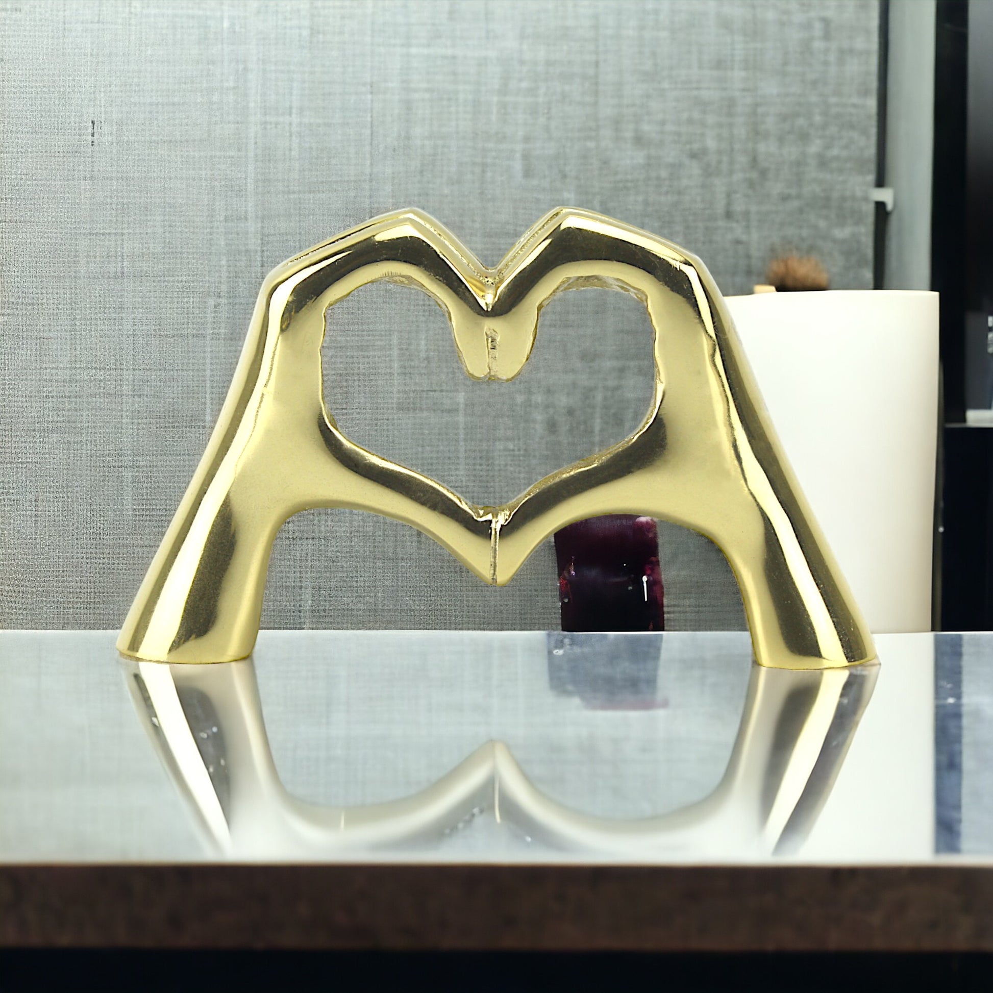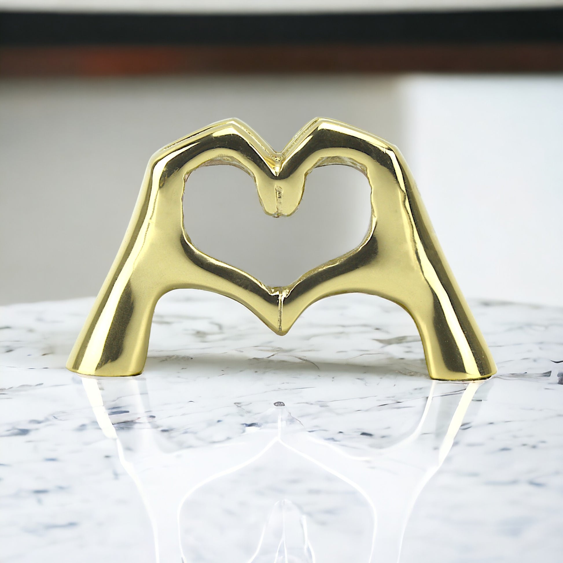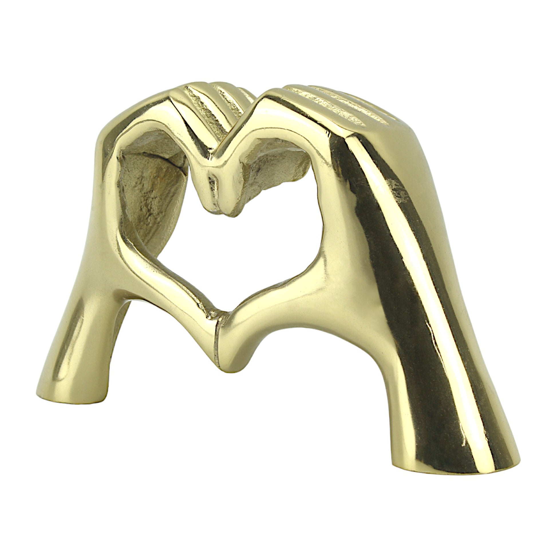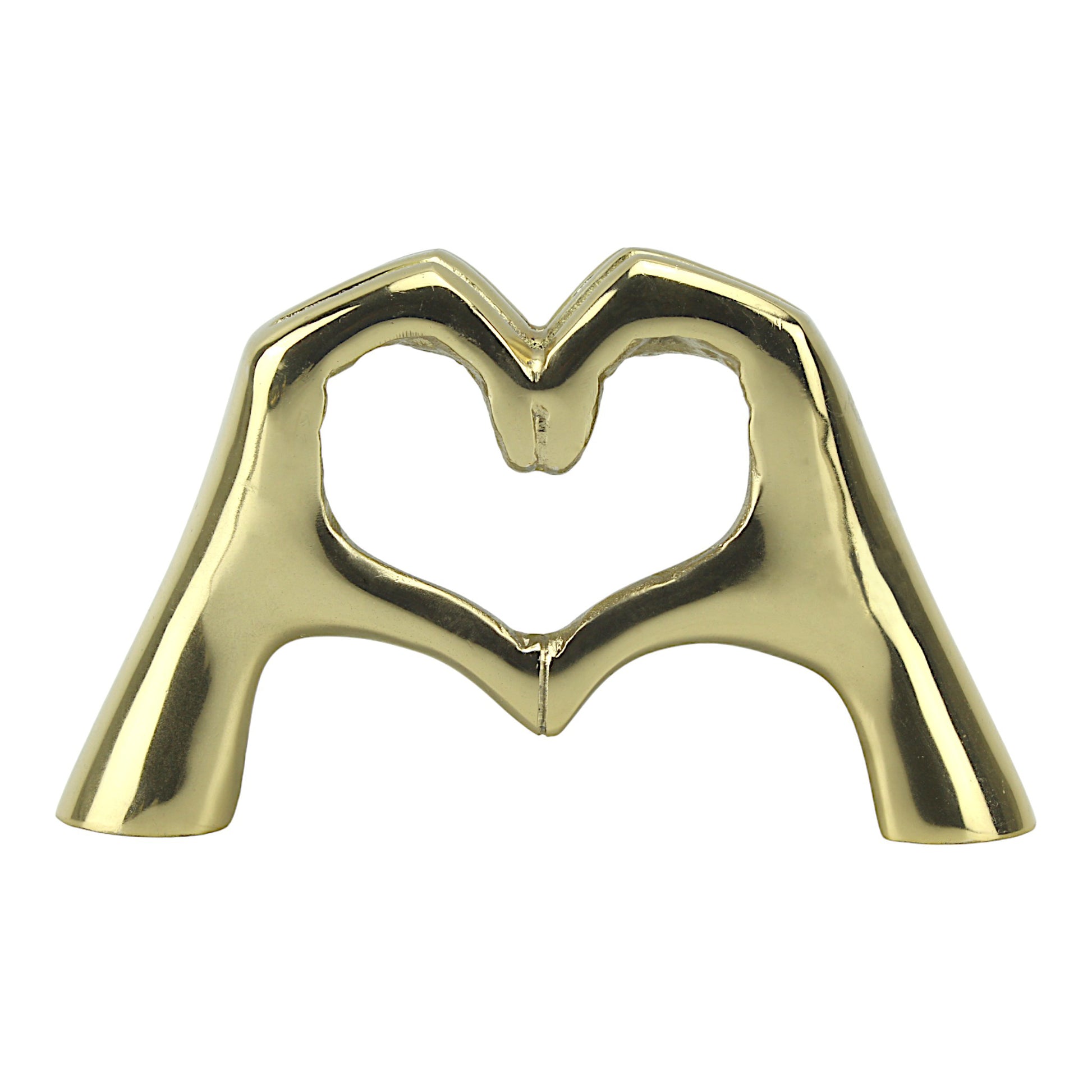 Introducing "Golden Embrace," a stunning handcrafted aluminum sculpture capturing the timeless essence of love and togetherness. Crafted with exquisite detail, this sculpture depicts two hands forming a heart, symbolizing the enduring bond between two souls. With its radiant golden finish and captivating design, "Golden Embrace" serves as a heartfelt accent piece for any home.
