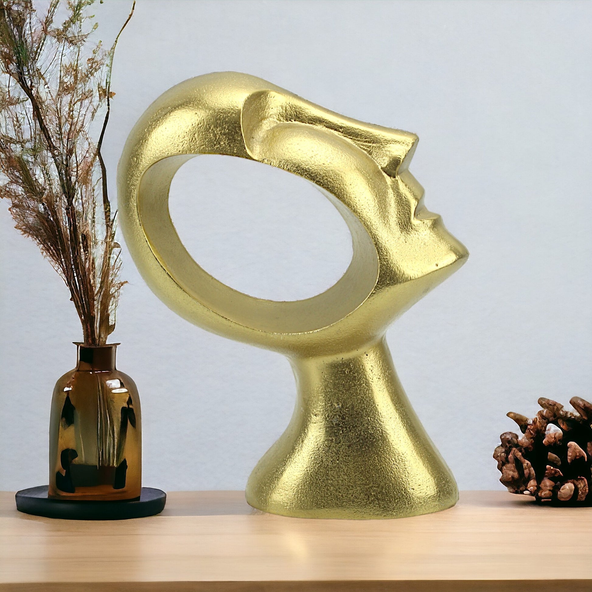 Introducing "Golden Gaze," a mesmerizing handcrafted aluminum sculpture ornament featuring a captivating human face, elegantly showcased on a sleek marble base. This exquisite piece exudes sophistication and intrigue, adding a touch of artistic allure to any space.
