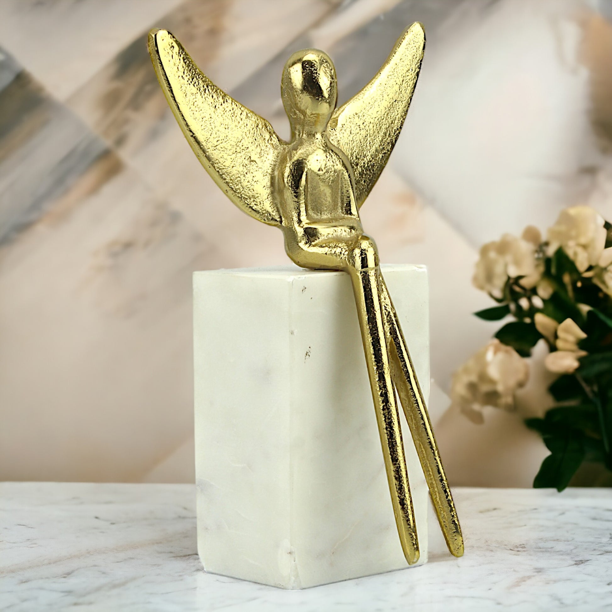 Introducing "Golden Seraph," a celestial handcrafted aluminum angel sculpture delicately perched on a marble rock base. This exquisite ornament embodies grace and beauty, adding a touch of divine elegance to any space.