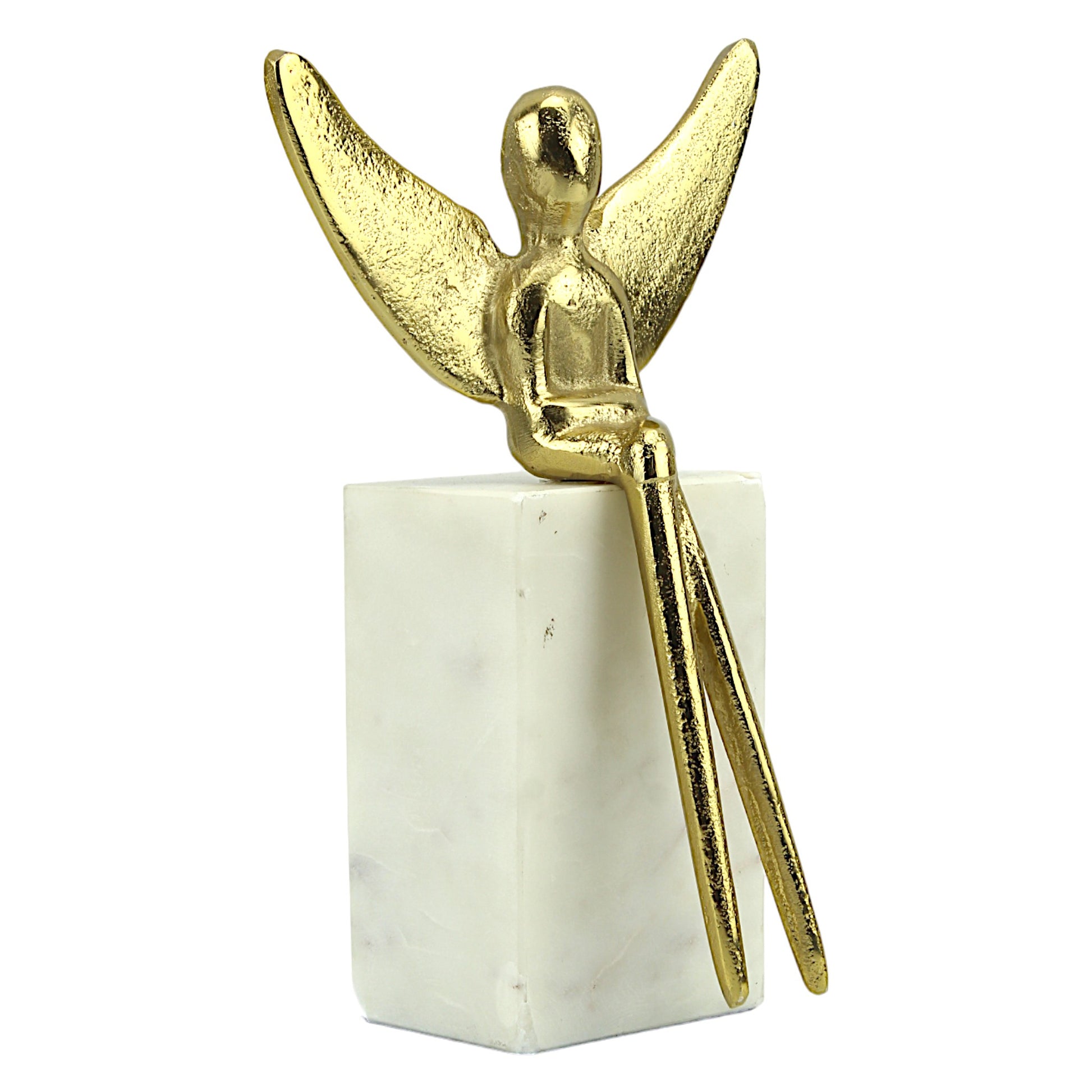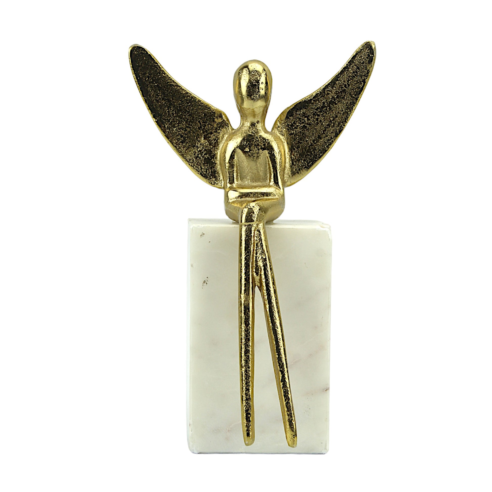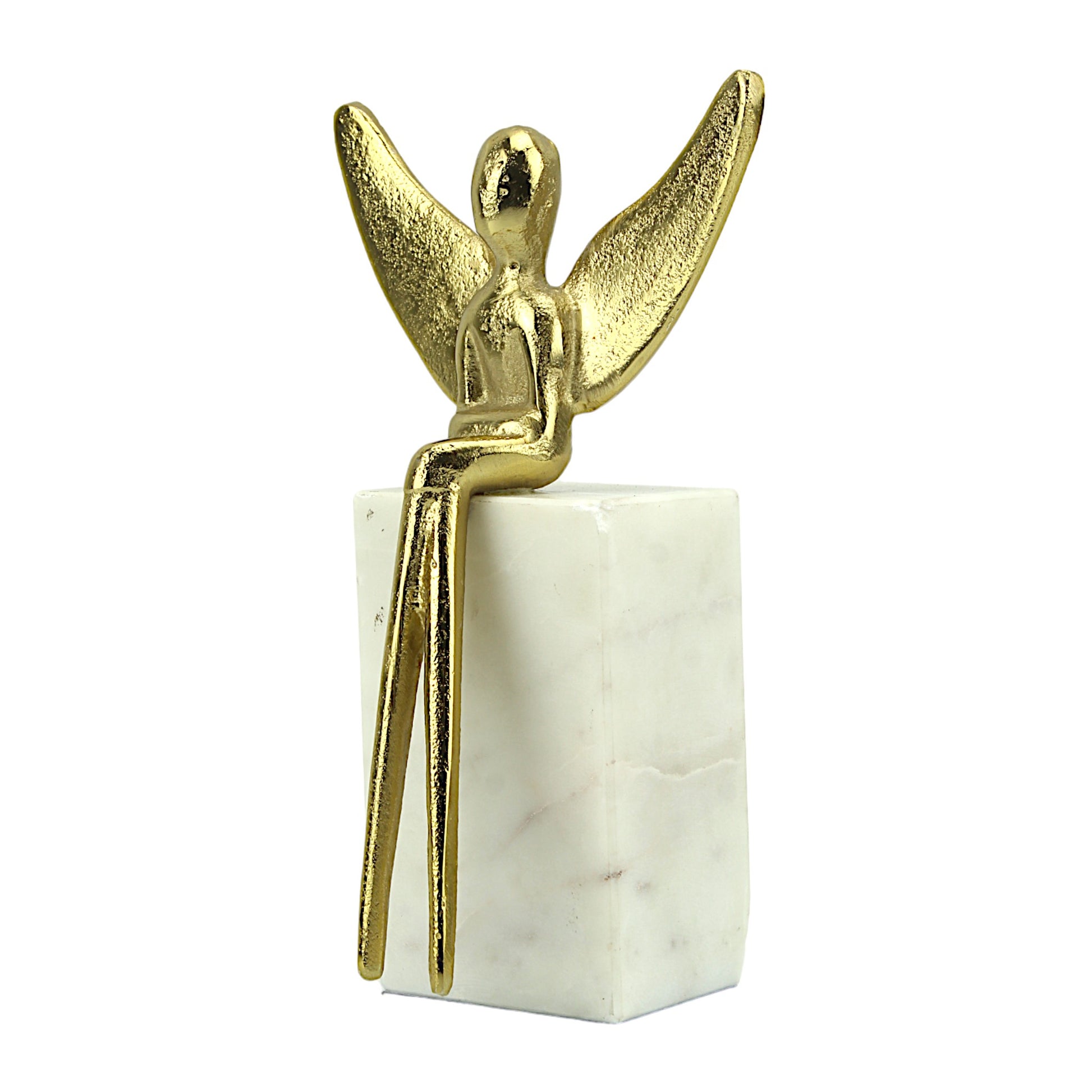 Golden Seraph: Handcrafted Aluminum Angel Sitting on Marble Rock Sculpture Decor Ornament