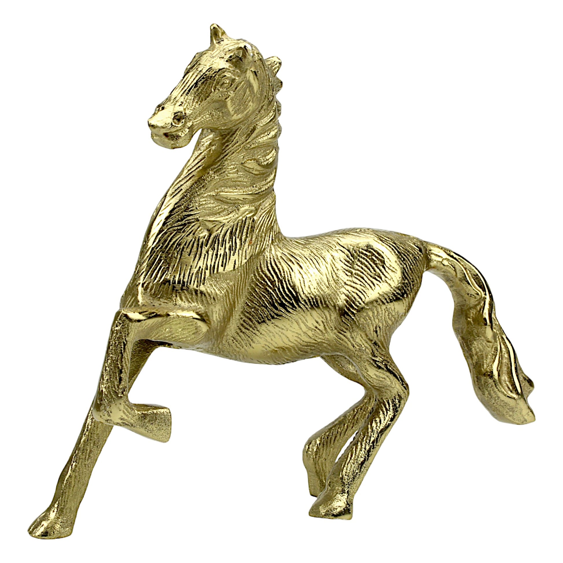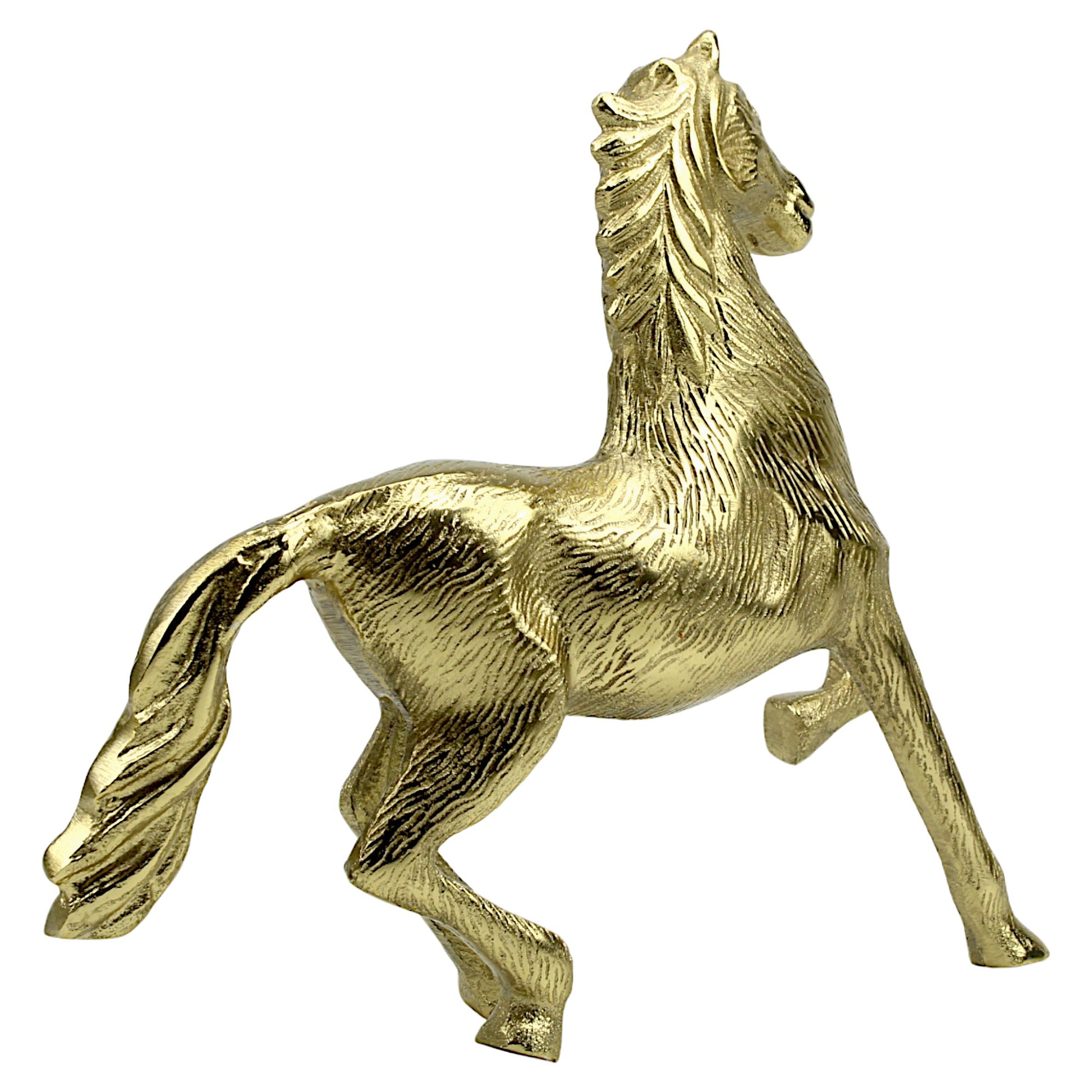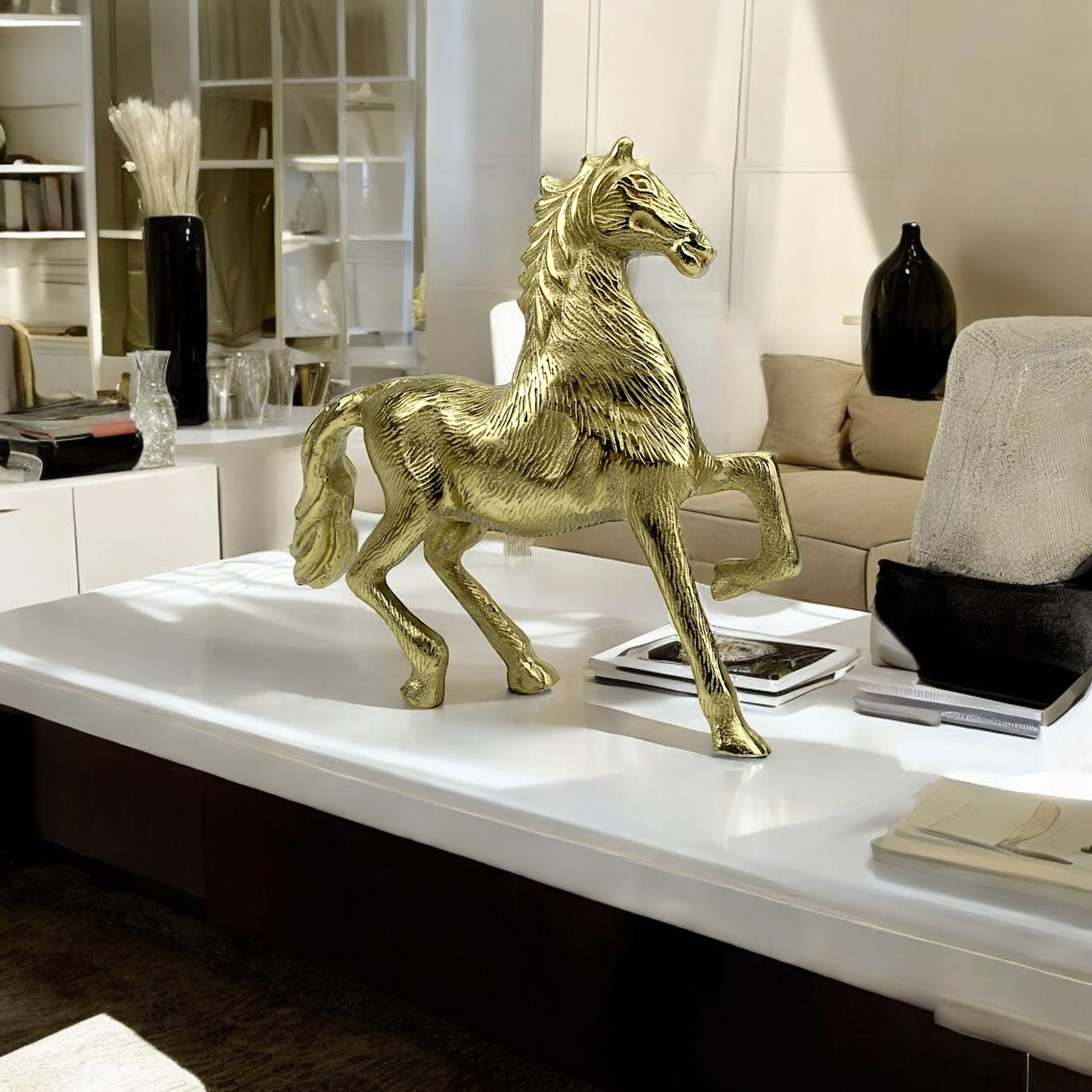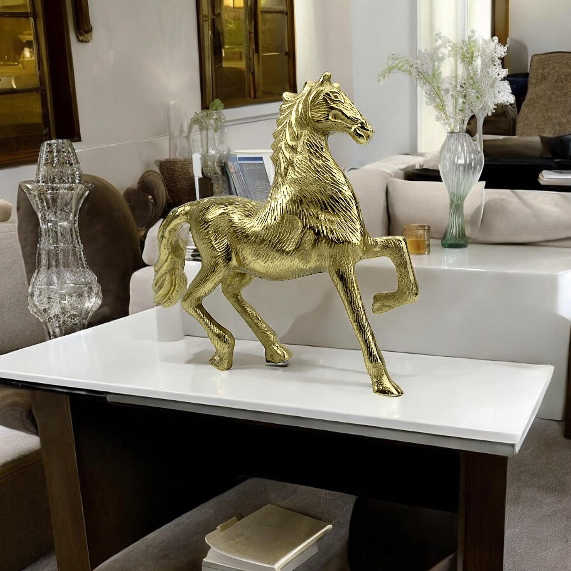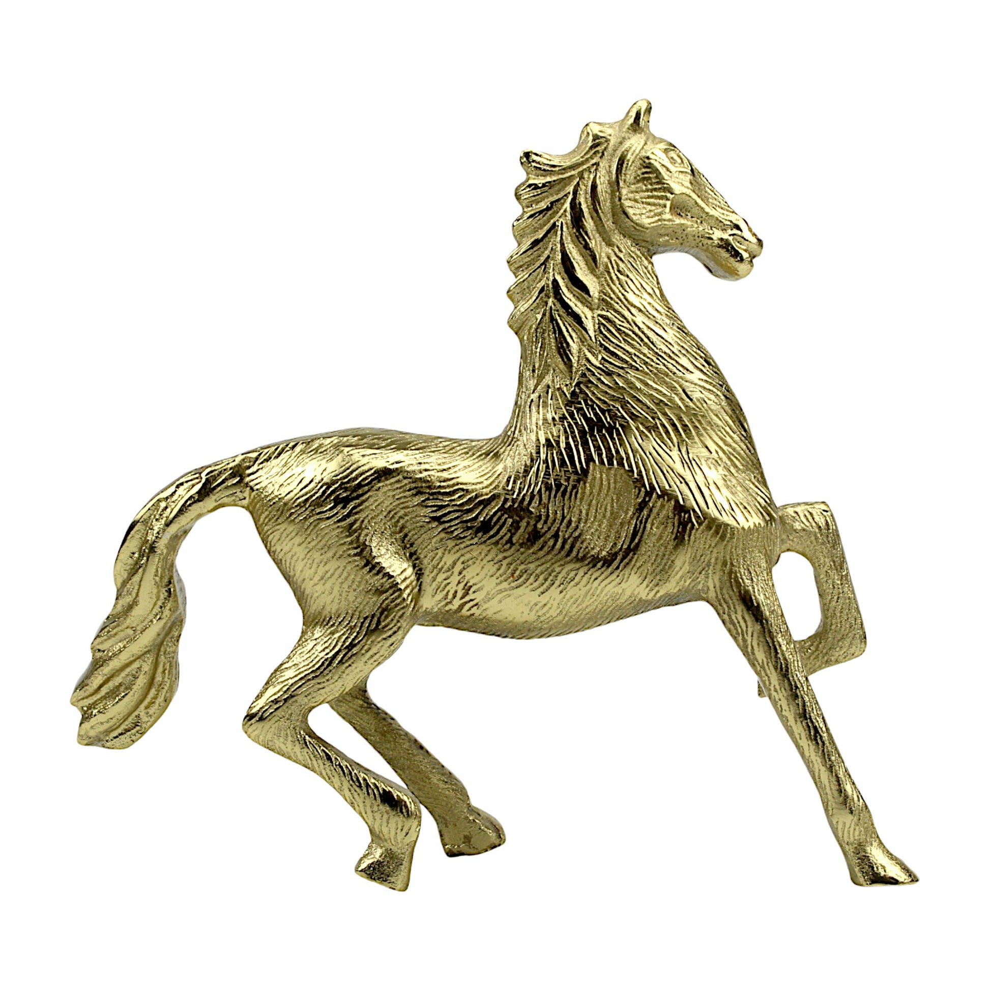 Enhance the majesty of your home decor with our Handcrafted Golden Aluminum Horse Sculpture Ornament, a symbol of grace and strength meticulously crafted to adorn your living space.