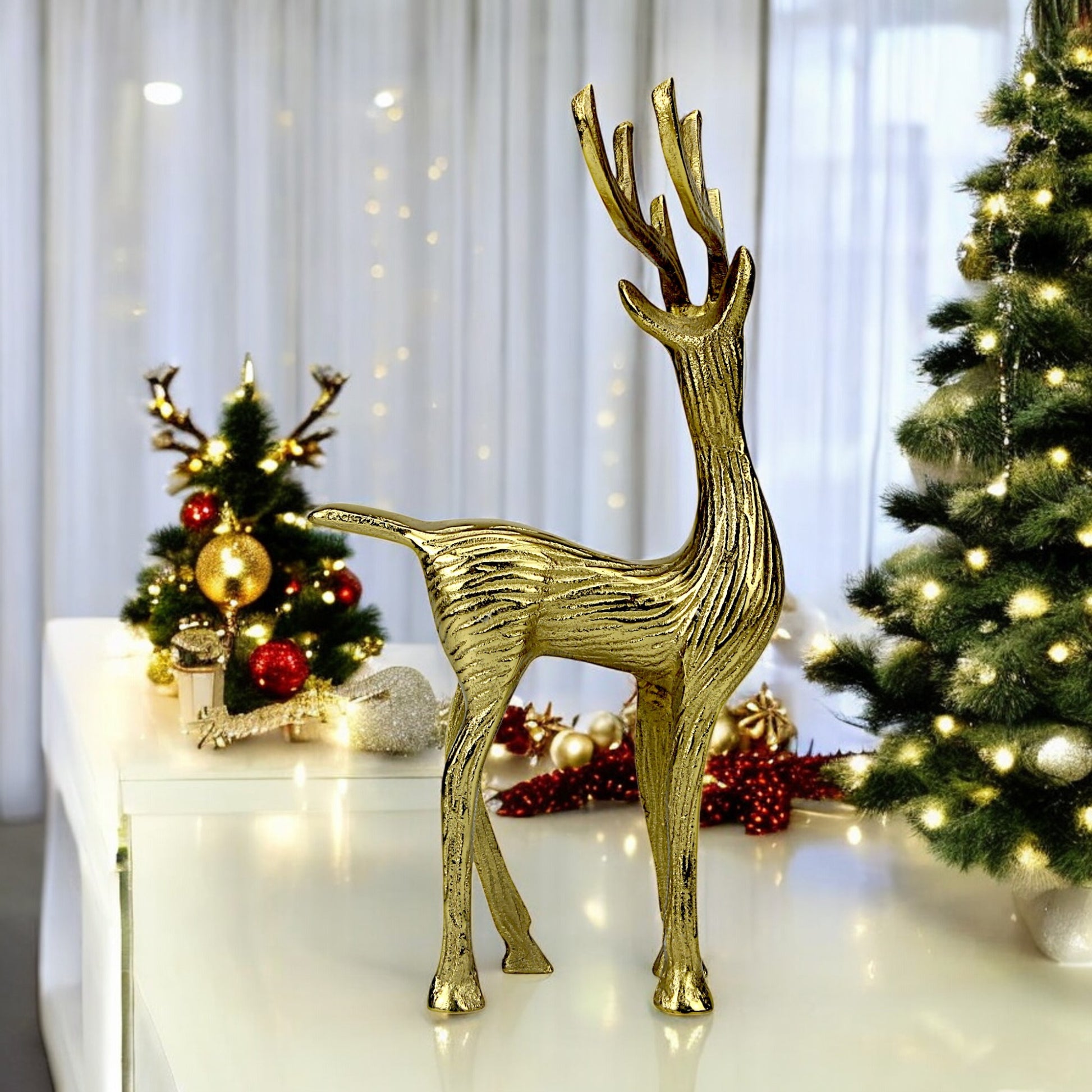 Elevate your Christmas decor with this Golden Aluminum Handcrafted Christmas Minimalistic Standing Deer from Hind Decor. With its sleek and minimalistic design, coupled with a radiant golden finish, this handcrafted deer brings modern elegance to your holiday home.