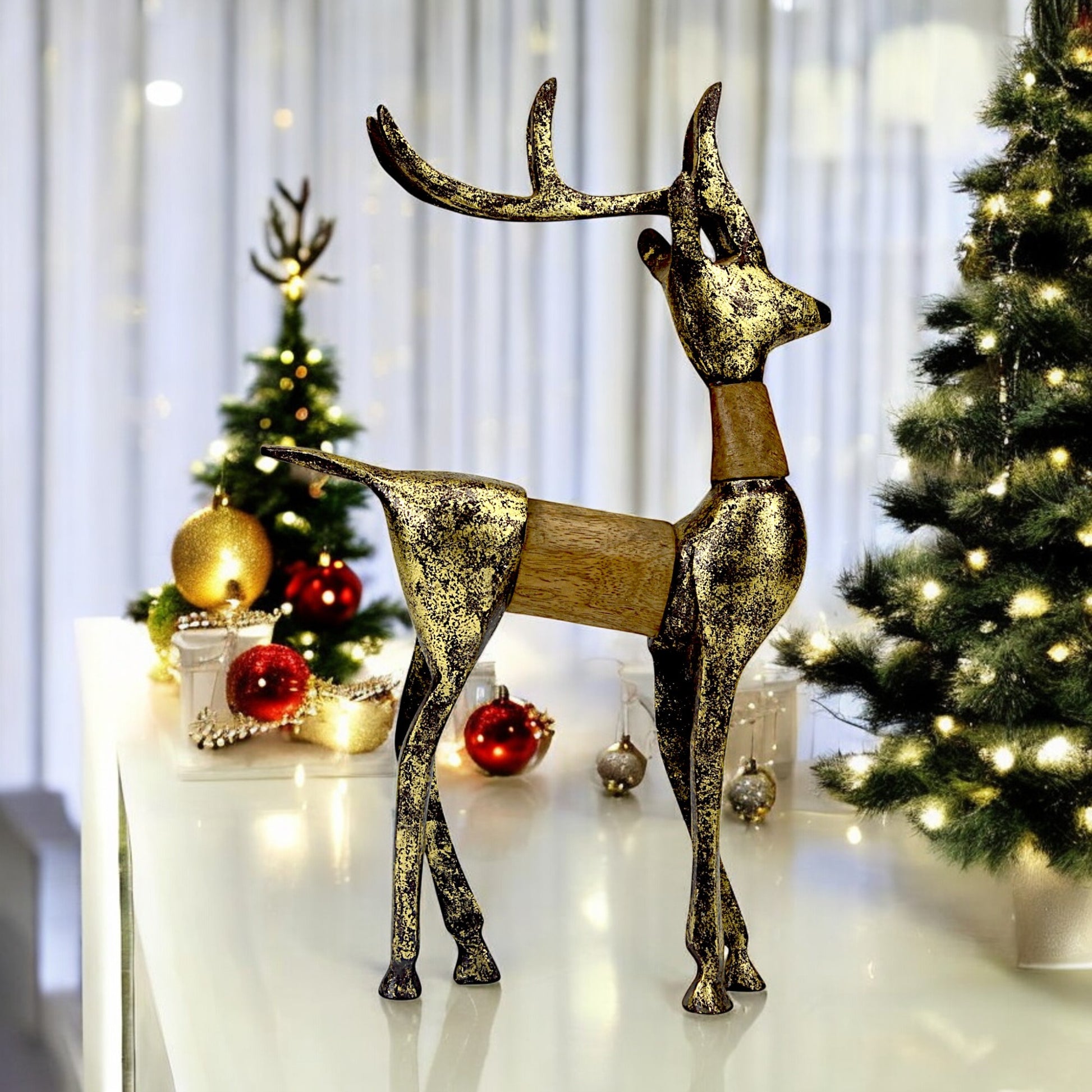 Enhance your Christmas decorations with the Golden Handcrafted Aluminum Christmas Reindeer with Wooden Finish on Back from Hind Decor. This stunning reindeer combines the elegance of golden aluminum with the natural warmth of a wooden back finish, creating a beautifully balanced piece that captures the essence of the season.