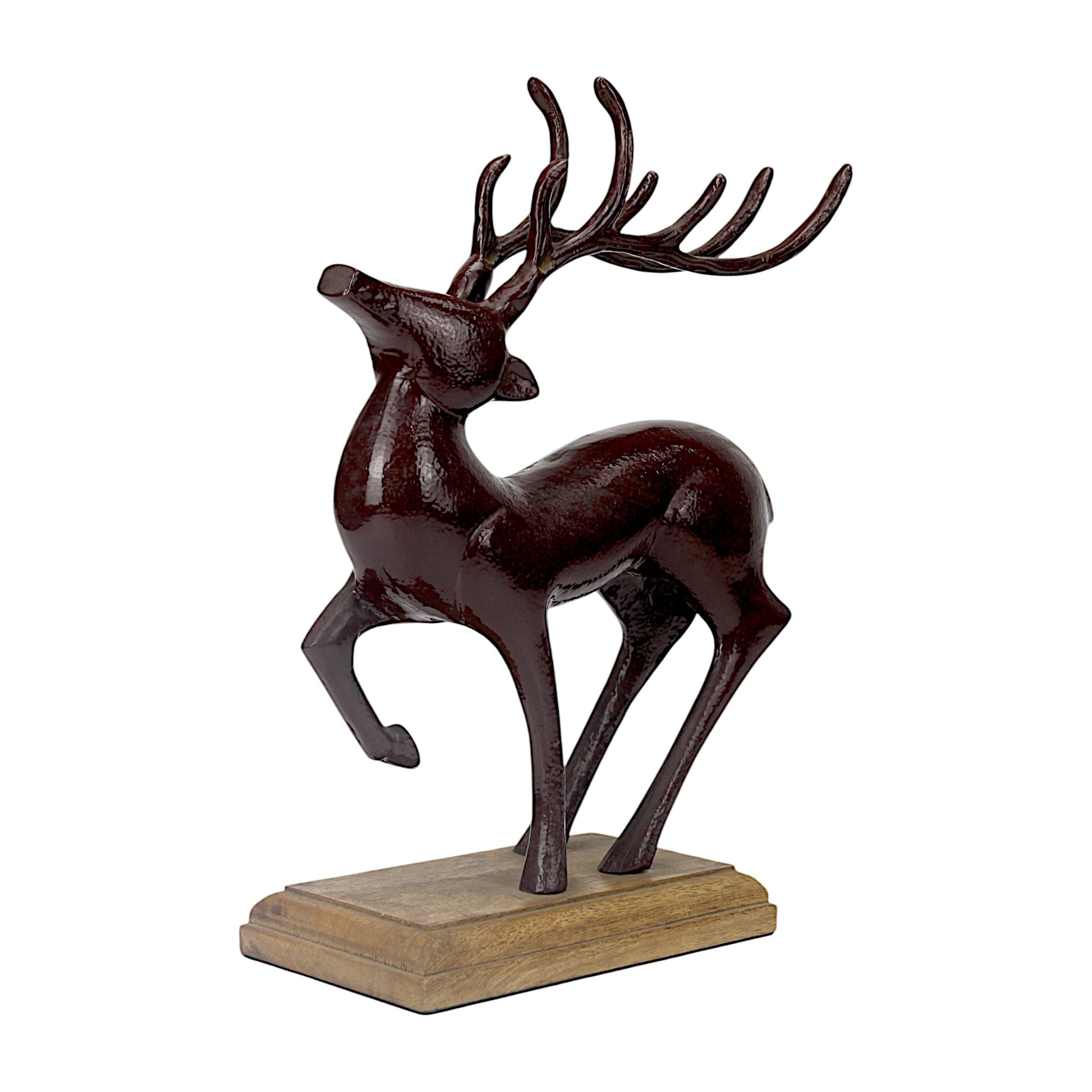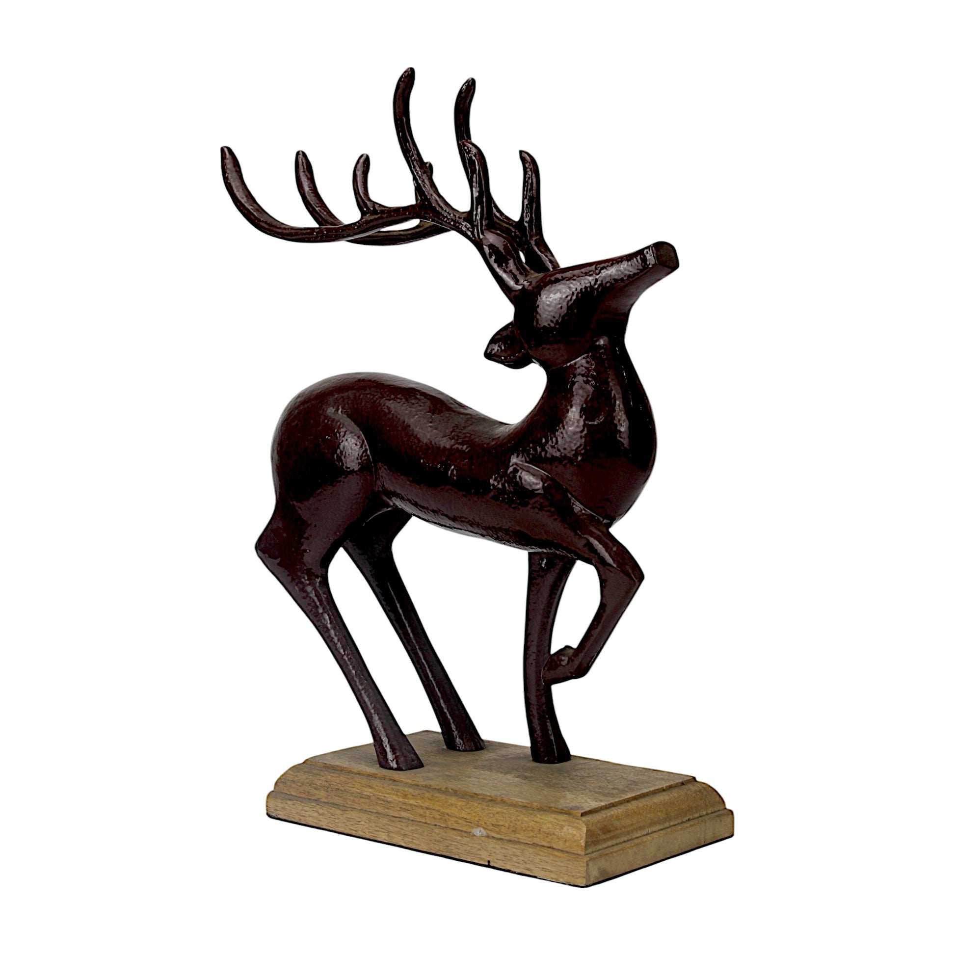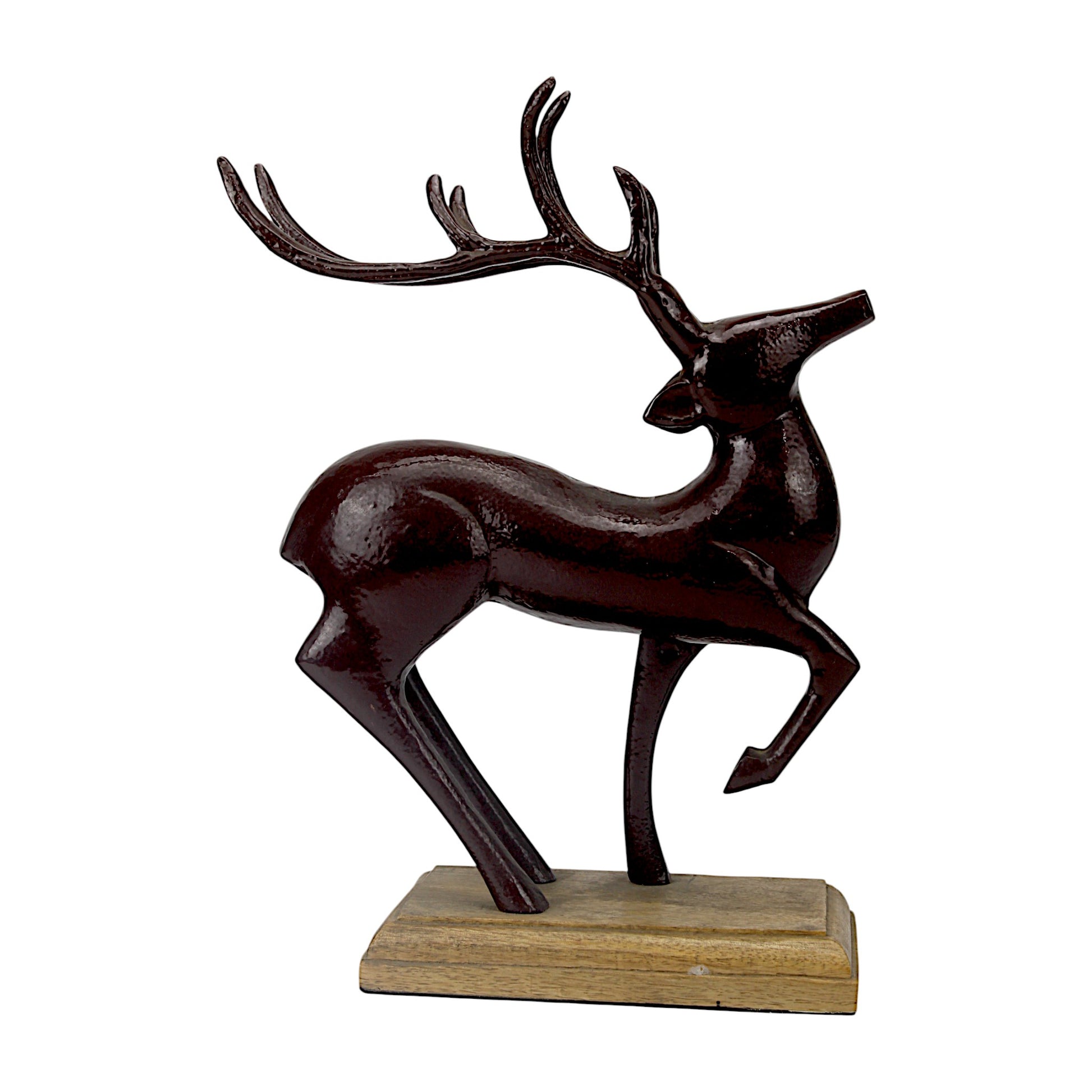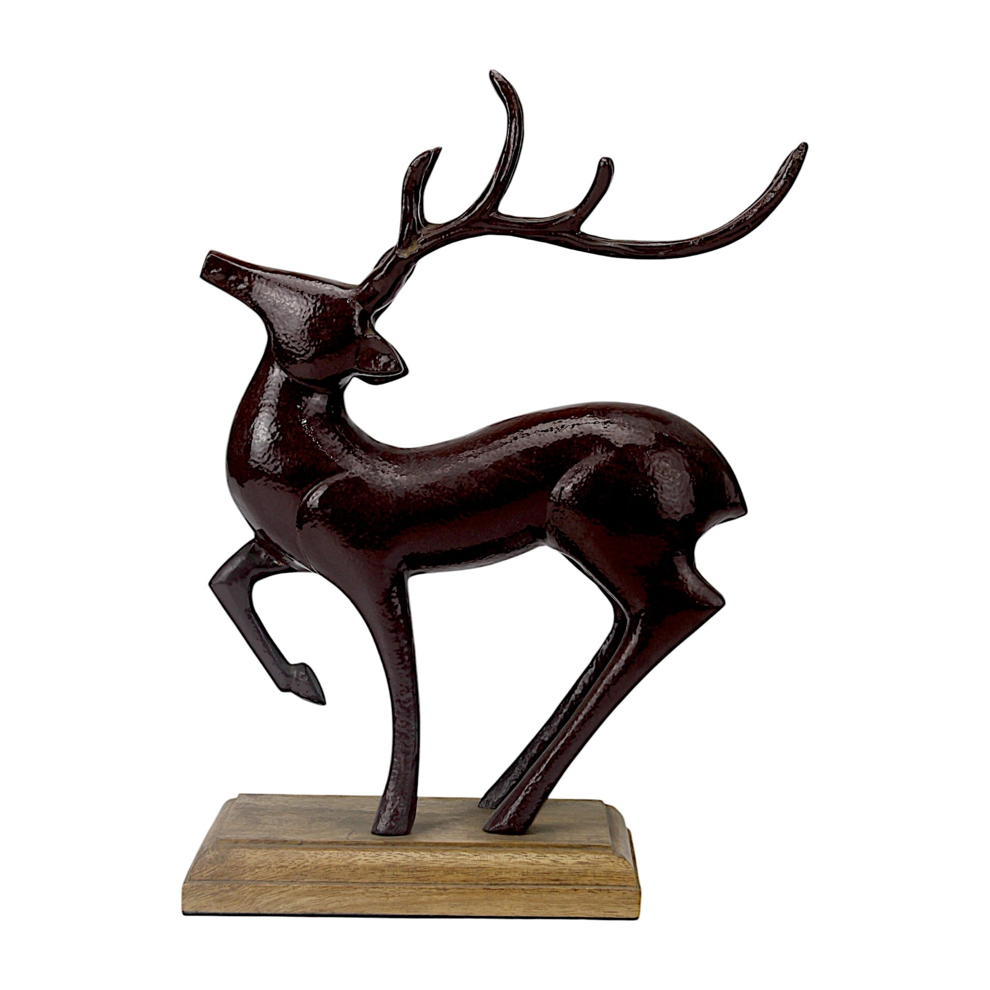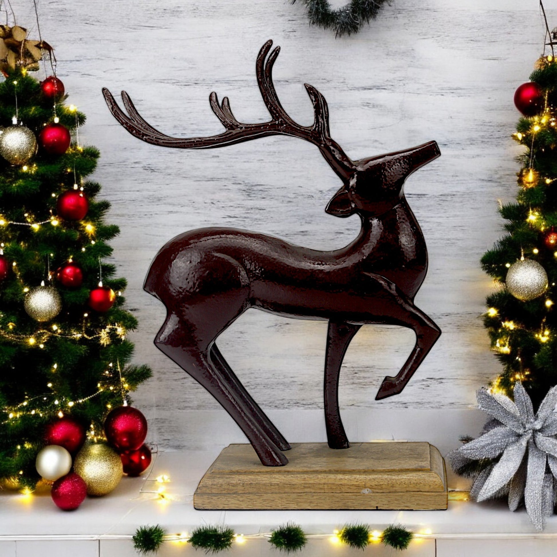 Capture the spirit of the season with the Dark Red Aluminum Long Horn Minimalistic Running Reindeer on Wooden Base from Hind Decor. This beautifully handcrafted reindeer, with its dynamic running posture and sleek long horns, is finished in a deep dark red aluminum, and mounted on a sturdy wooden base for an elegant, timeless look. Perfect for adding movement and festive cheer to your Christmas displays.