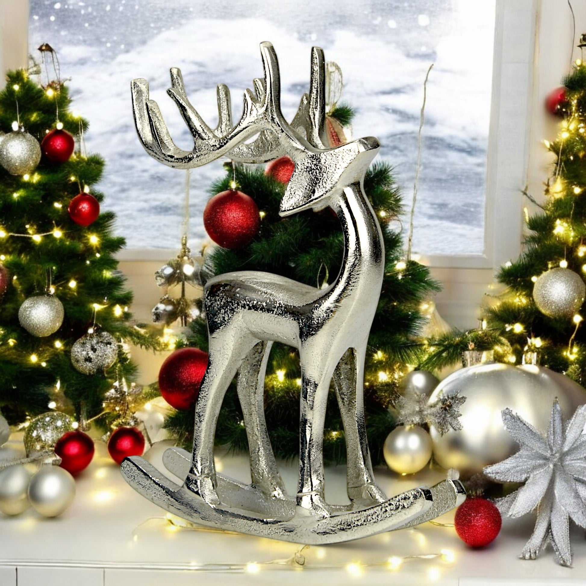 Add a whimsical yet elegant touch to your Christmas decor with the Silver Aluminum Reindeer on Rocking Base from Hind Decor. This beautifully crafted reindeer, made from premium aluminum with a sleek silver finish, sits gracefully on a rocking base, creating a dynamic and festive centerpiece for your holiday displays.