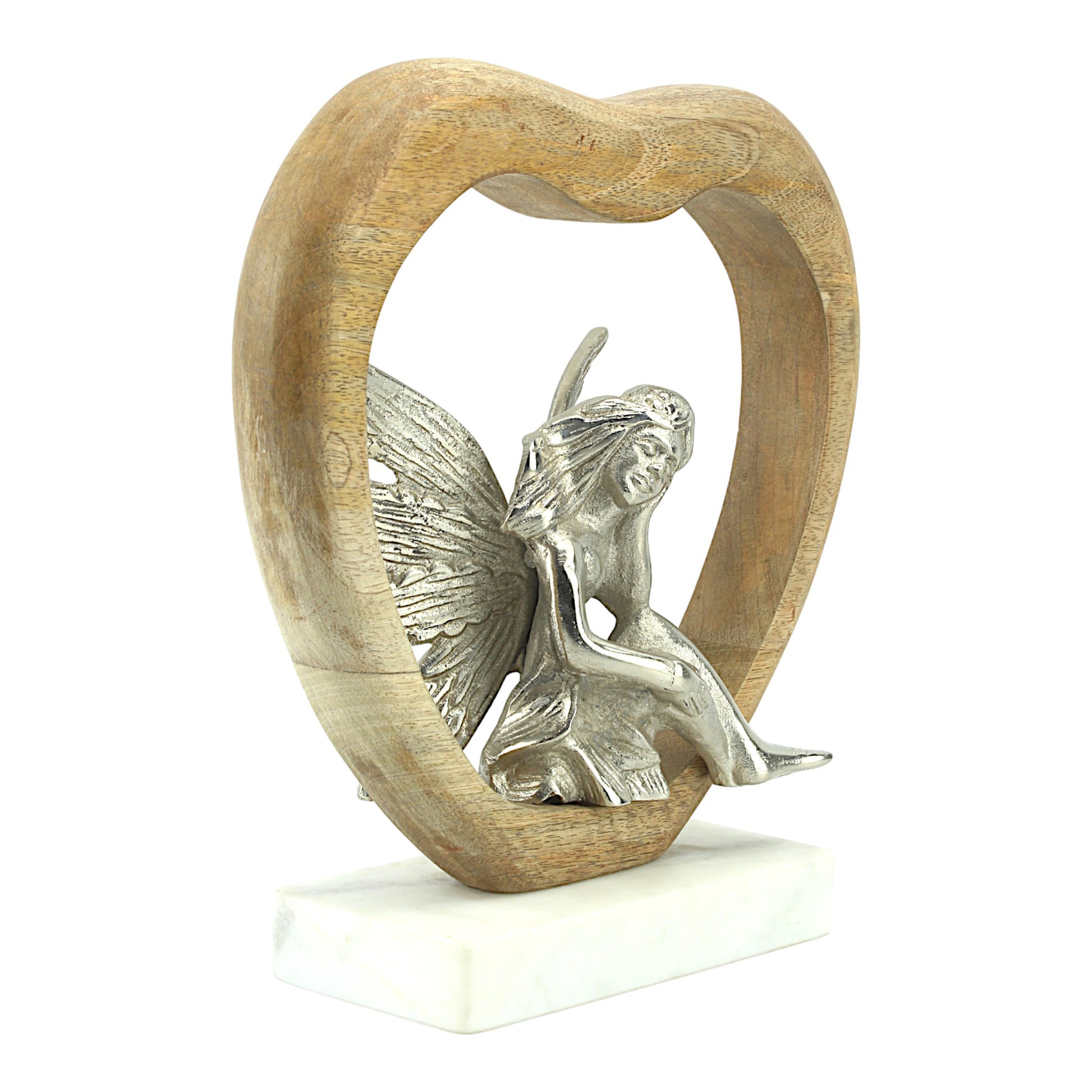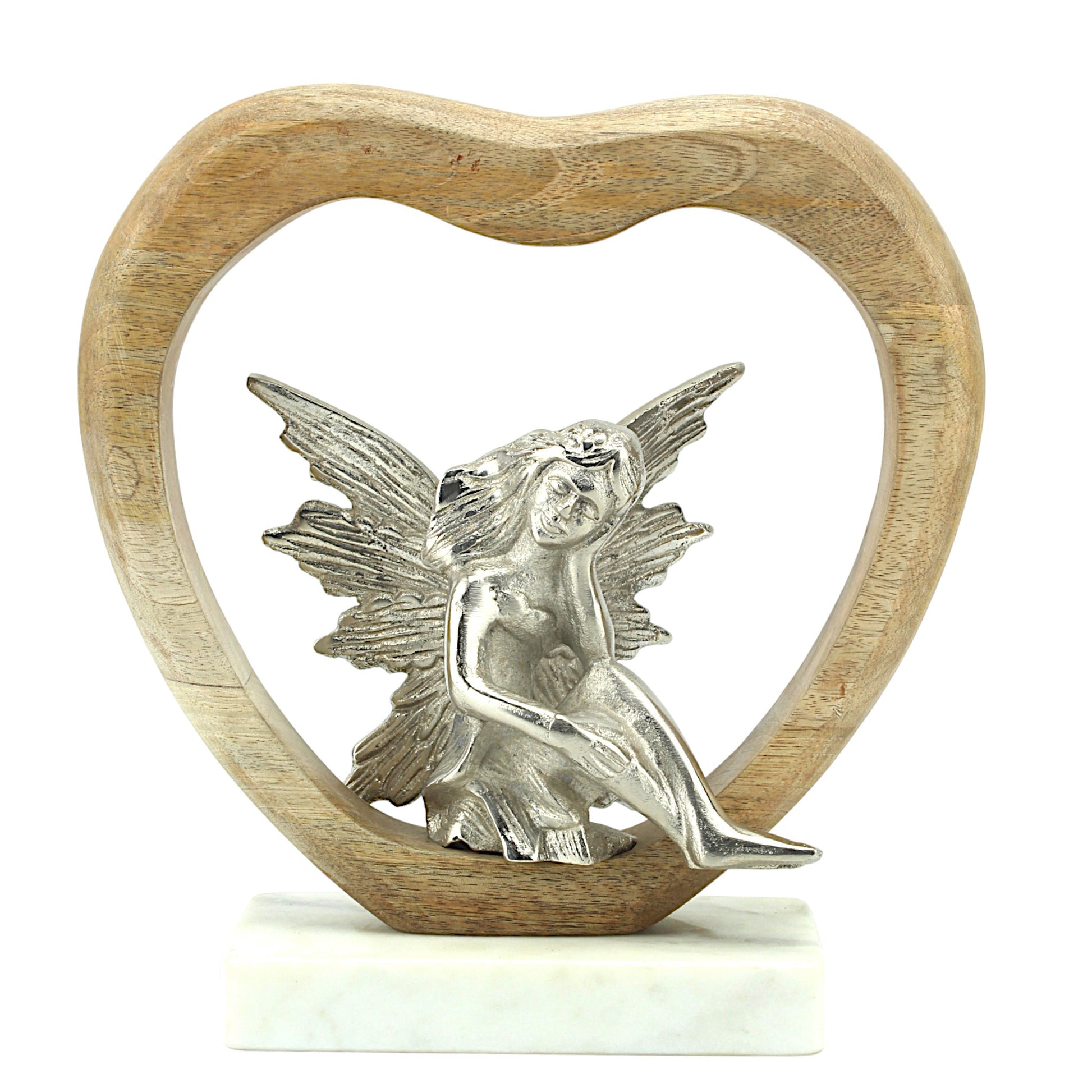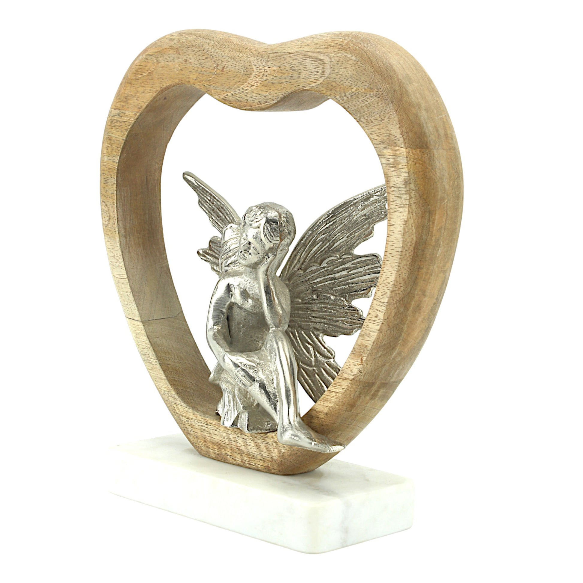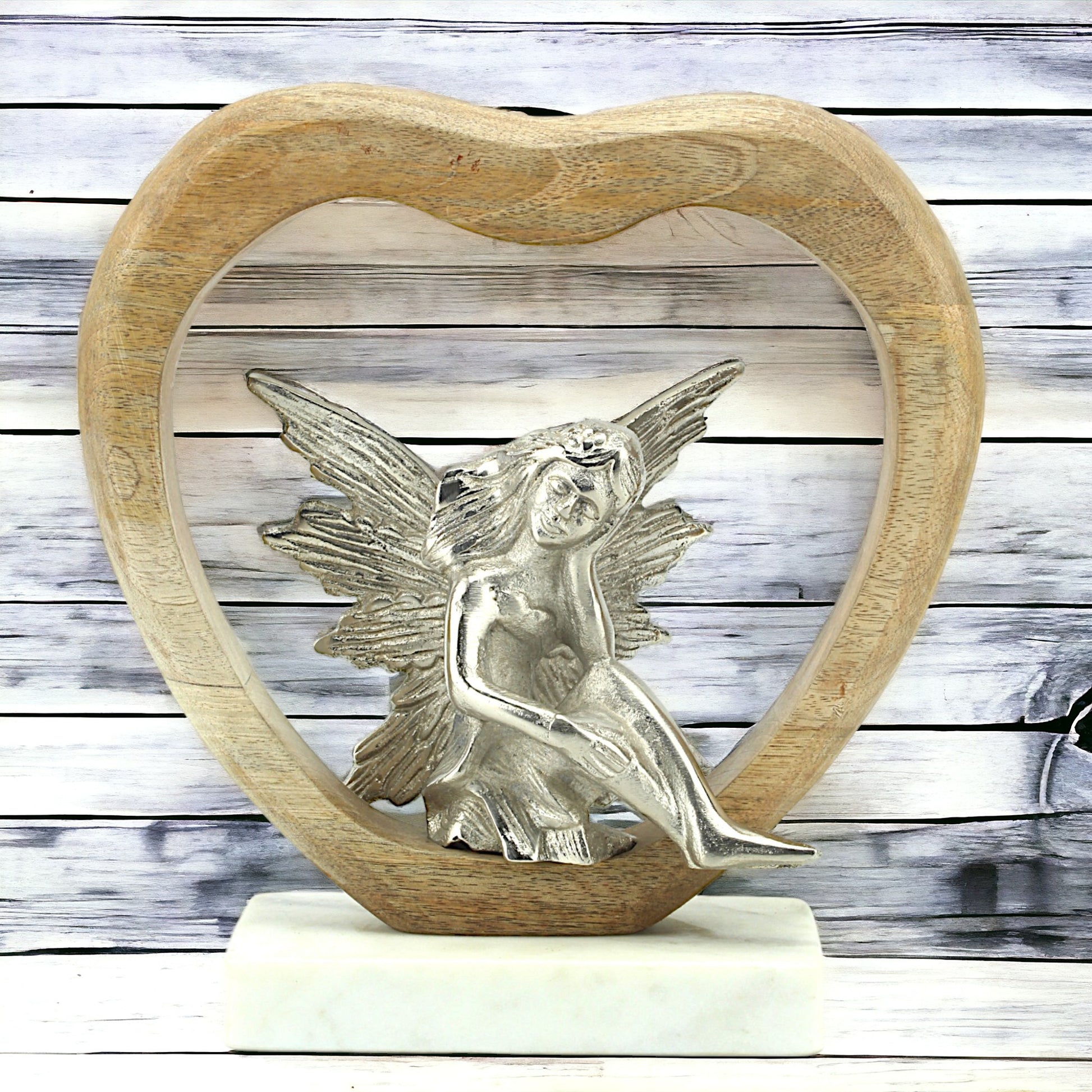 Seraphic Serenity: Handcrafted Silver Aluminium Angel Sitting in Wooden Heart on Marble Base