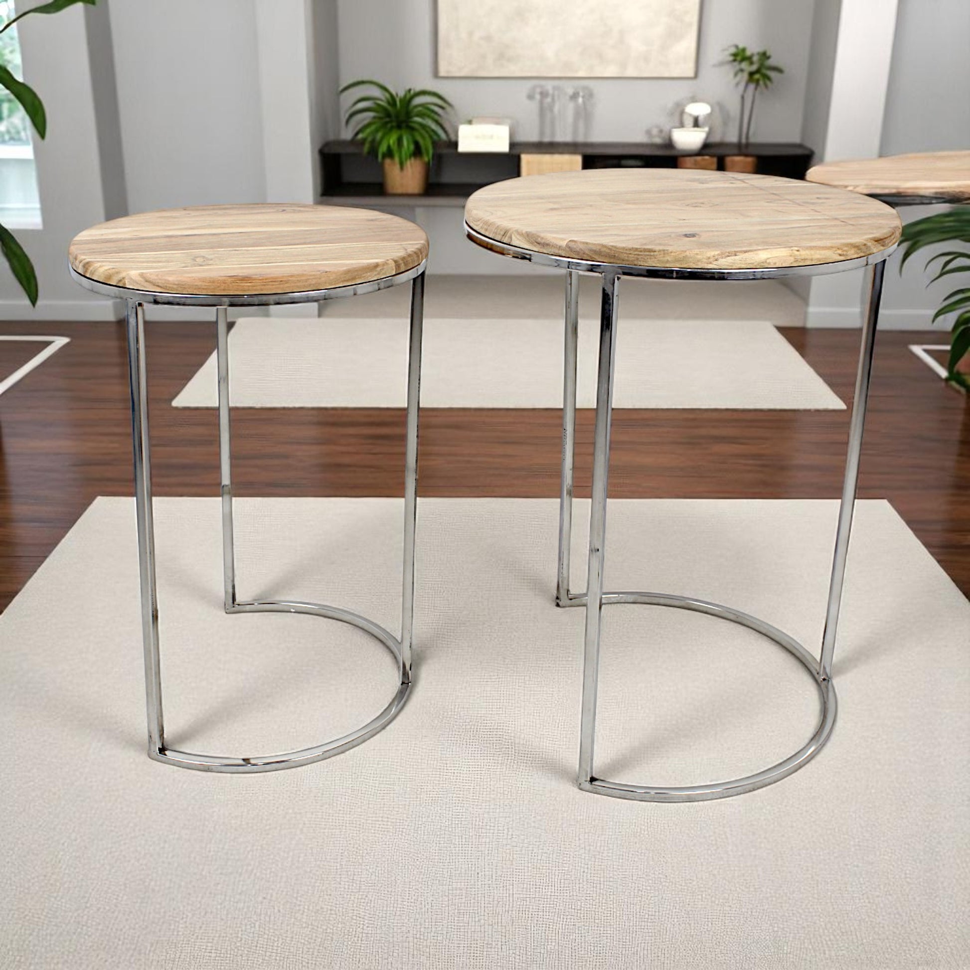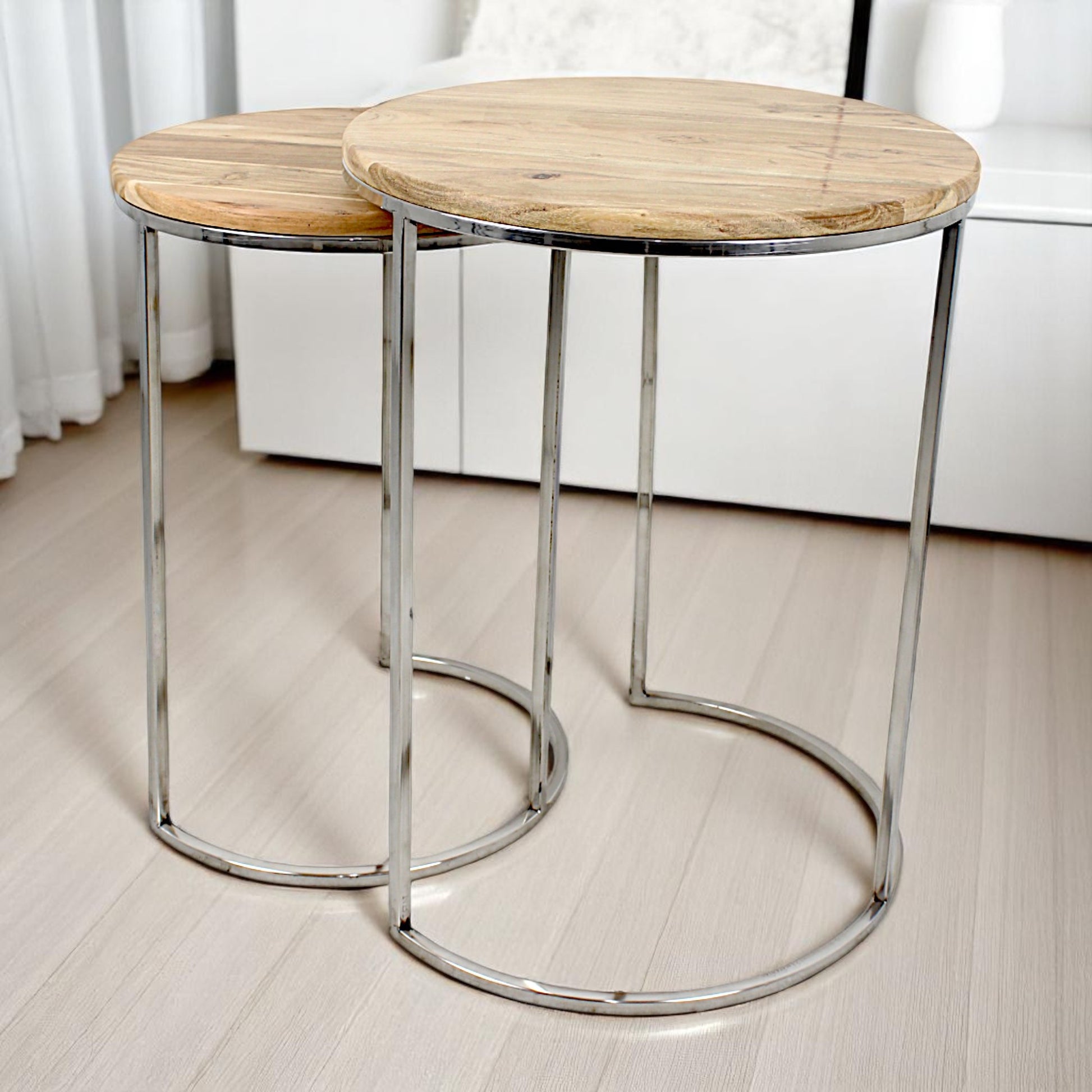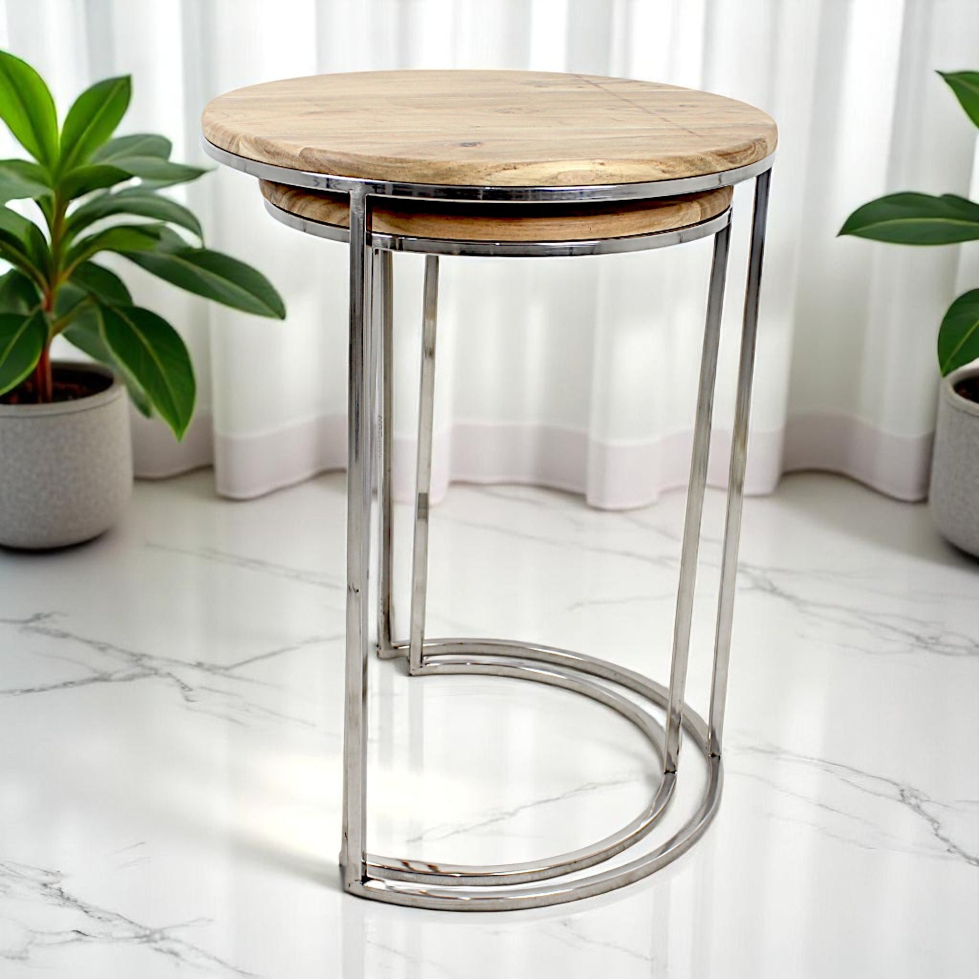 levate your home decor with this elegant Set of 2 Handcrafted Round Side Tables, featuring a stunning combination of natural wood tops and sleek metal bases. The circular tabletops are made from solid wood with a beautiful grain pattern, offering a warm, rustic touch. Supported by minimalist stainless steel half-moon legs, these nesting tables bring a contemporary flair that suits modern, industrial, or Scandinavian interiors.