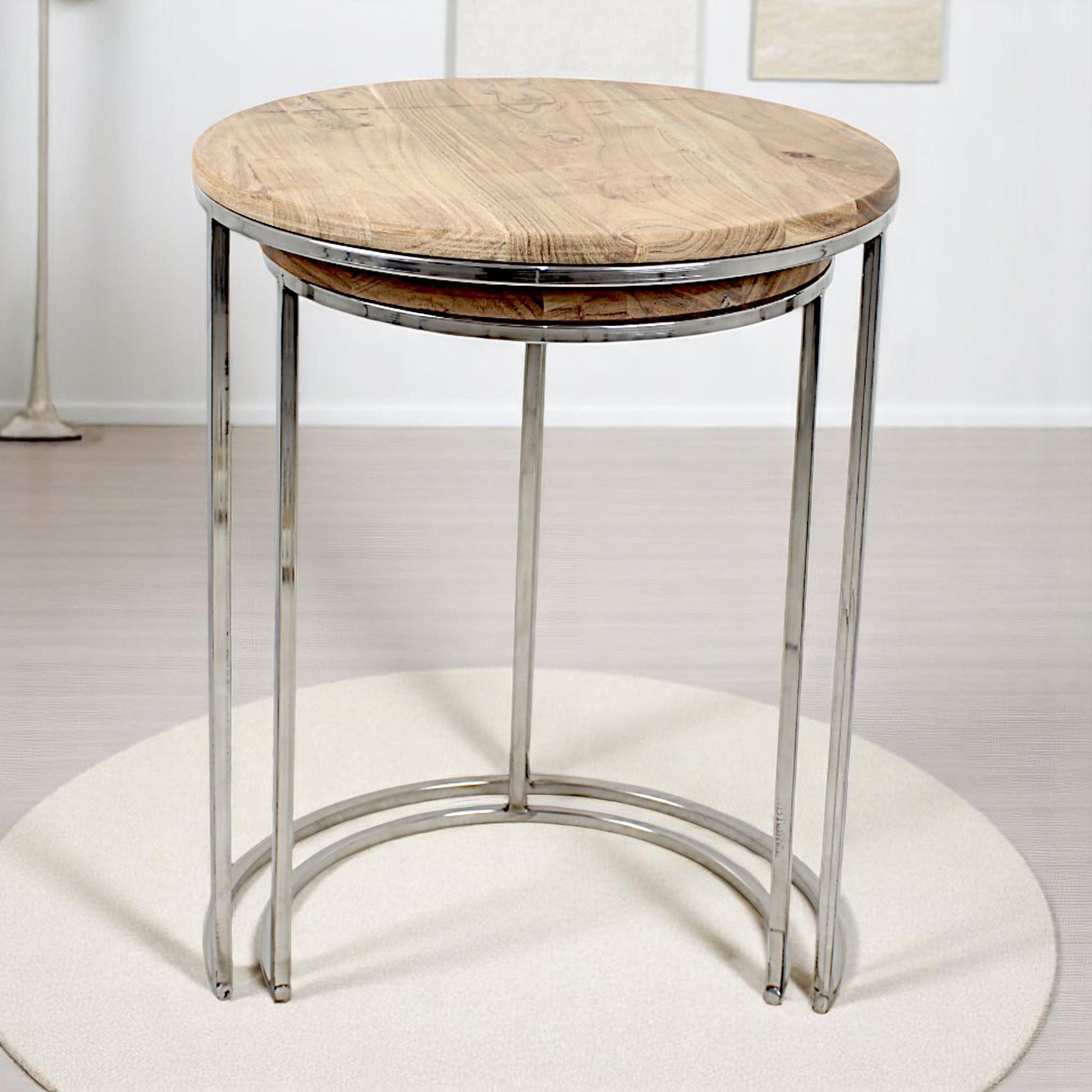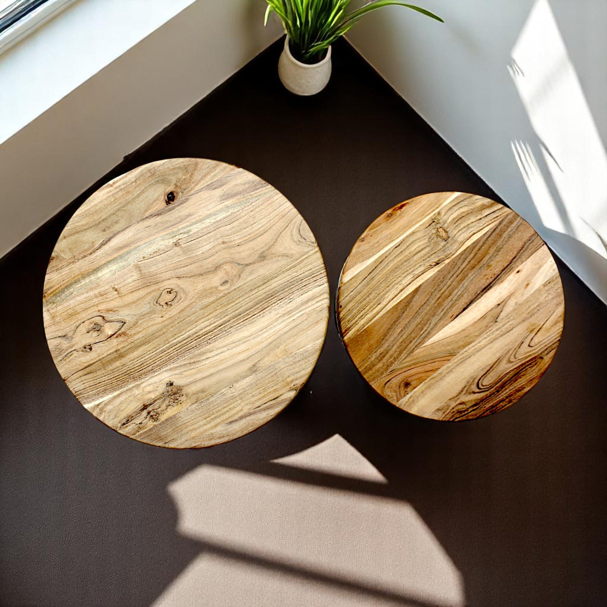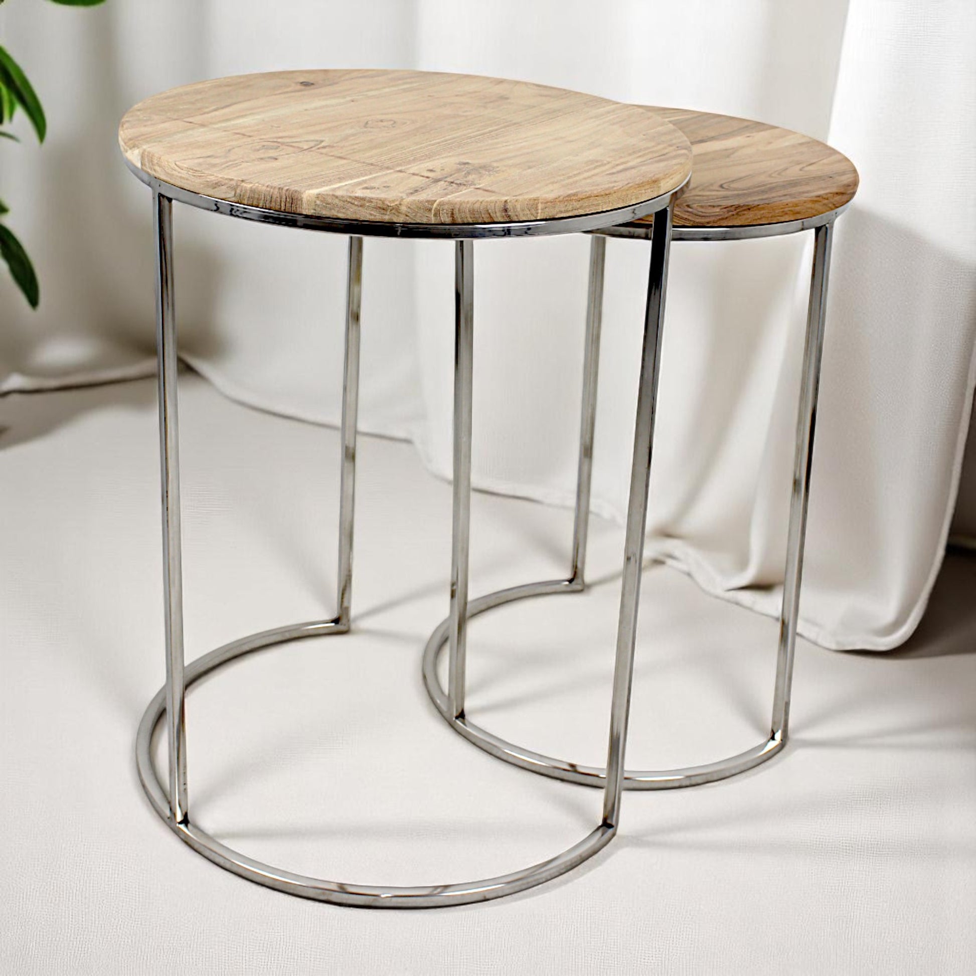 levate your home decor with this elegant Set of 2 Handcrafted Round Side Tables, featuring a stunning combination of natural wood tops and sleek metal bases. The circular tabletops are made from solid wood with a beautiful grain pattern, offering a warm, rustic touch. Supported by minimalist stainless steel half-moon legs, these nesting tables bring a contemporary flair that suits modern, industrial, or Scandinavian interiors.
