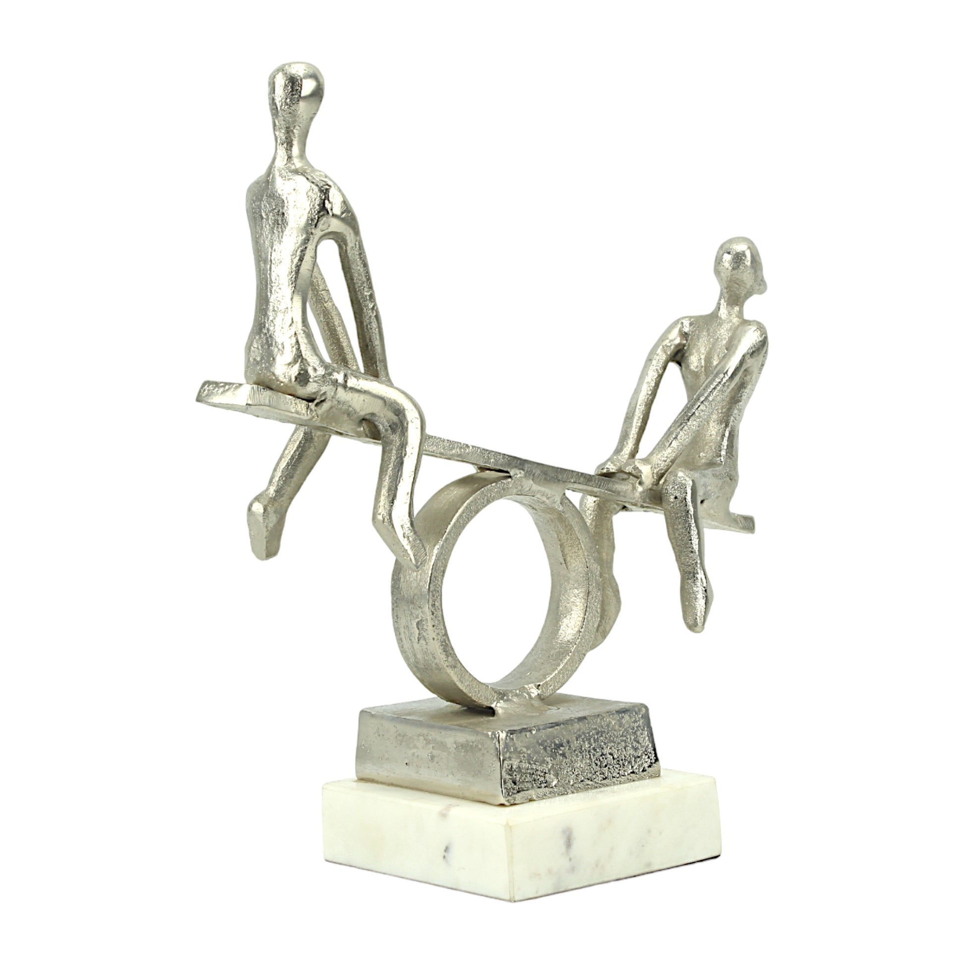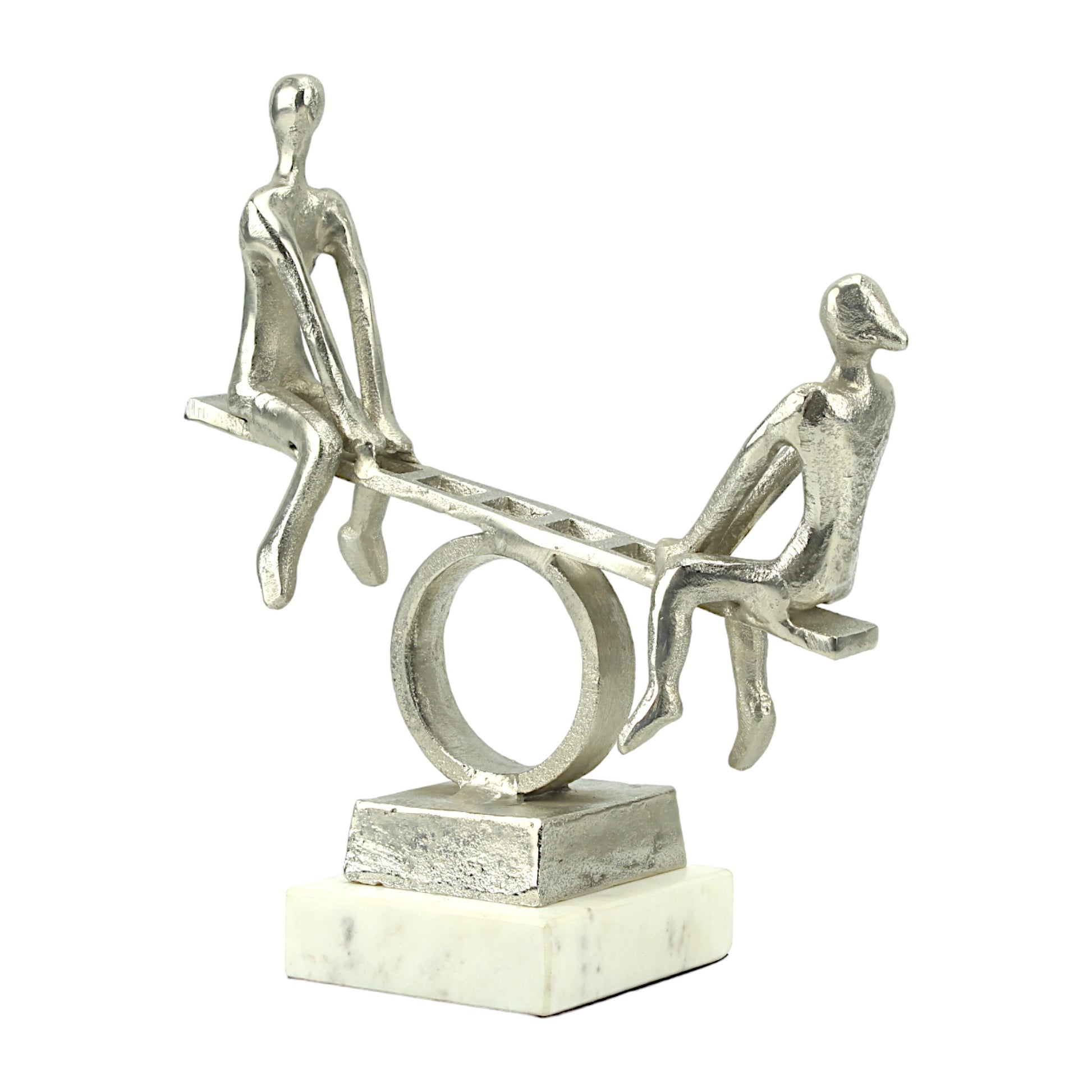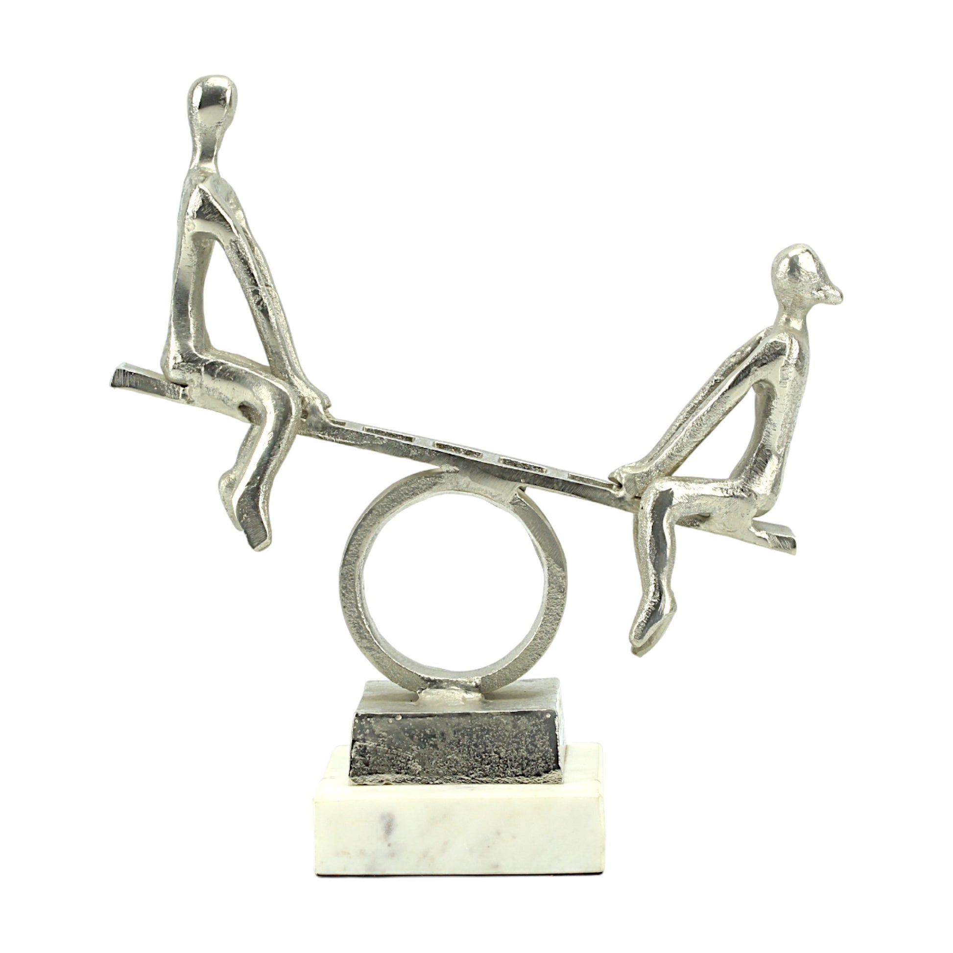 Silver Aluminum Couple on Seesaw Sculpture: Handcrafted Art on White Marble Base
